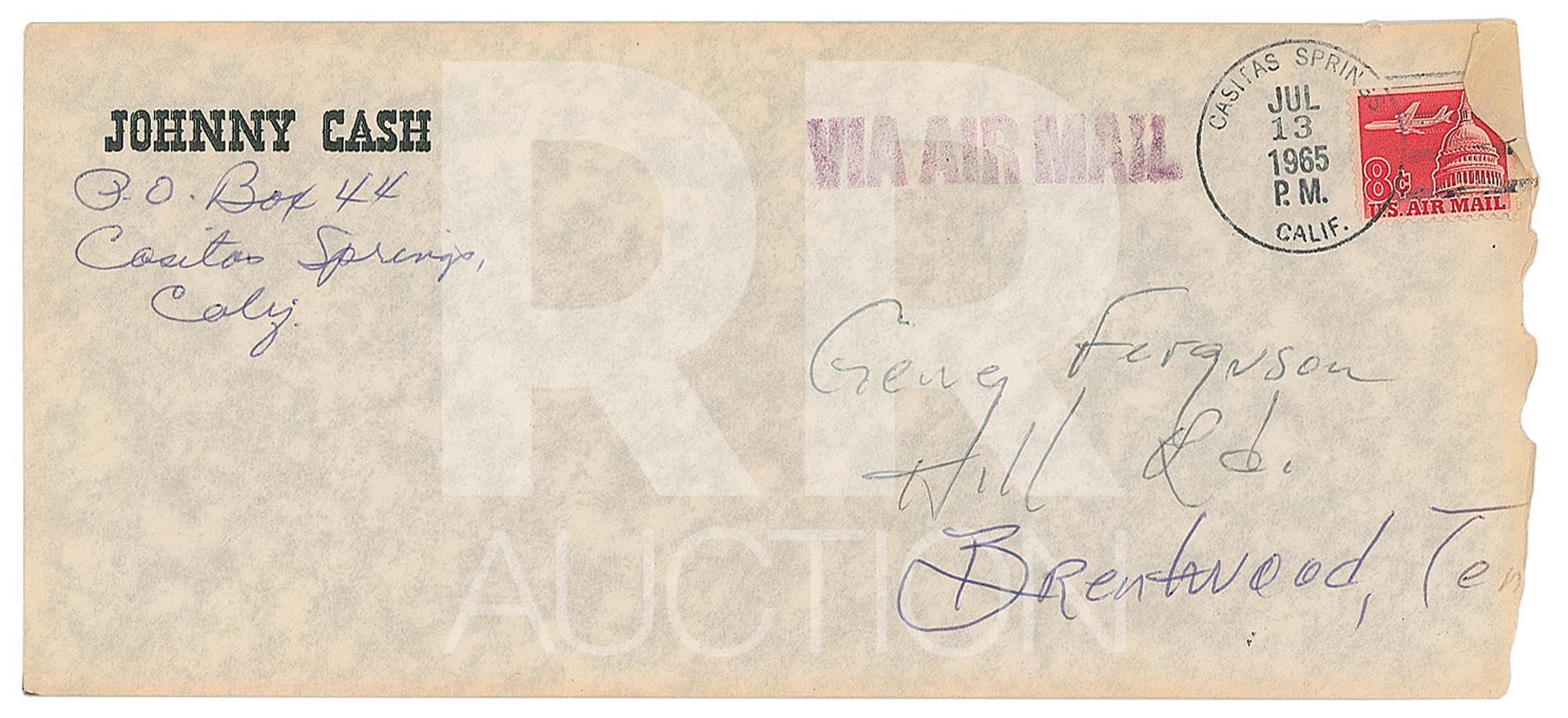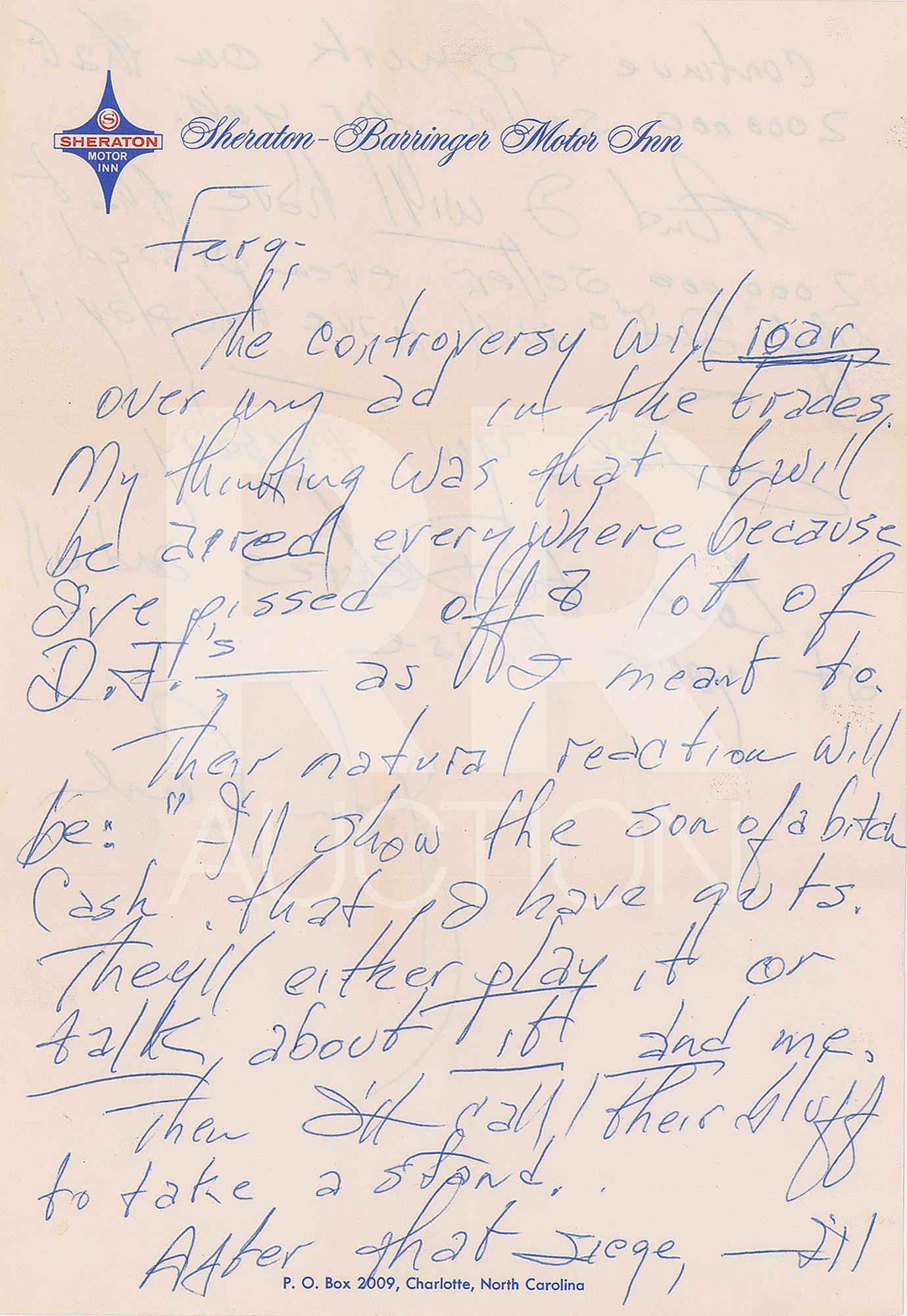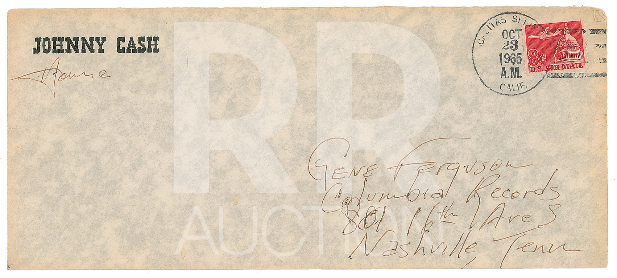 April 27, 1965, written from Oak View, California, on Sheraton-Barrington Motor Inn letterhead, in part: “The controversy will roar over any ad in the trades. My thinking was that it will be aired everywhere because I’ve pissed off a lot of D.J.’s—as I meant to. Their natural reaction will be: ‘I’ll show the son of a bitch Cash that I have guts.’ They’ll either play it or talk about it and me, then I’ll call their bluff to take a stand. After that siege,—I’ll continue to work on that 2,000,000 seller for you. And I will have that 2,000,00 seller. Even pissed off D.J.’s will have to play it.” Includes the original hand-addressed mailing envelope from “The Town House” in Kansas City, with Cash incorporating his autograph in the return address field.