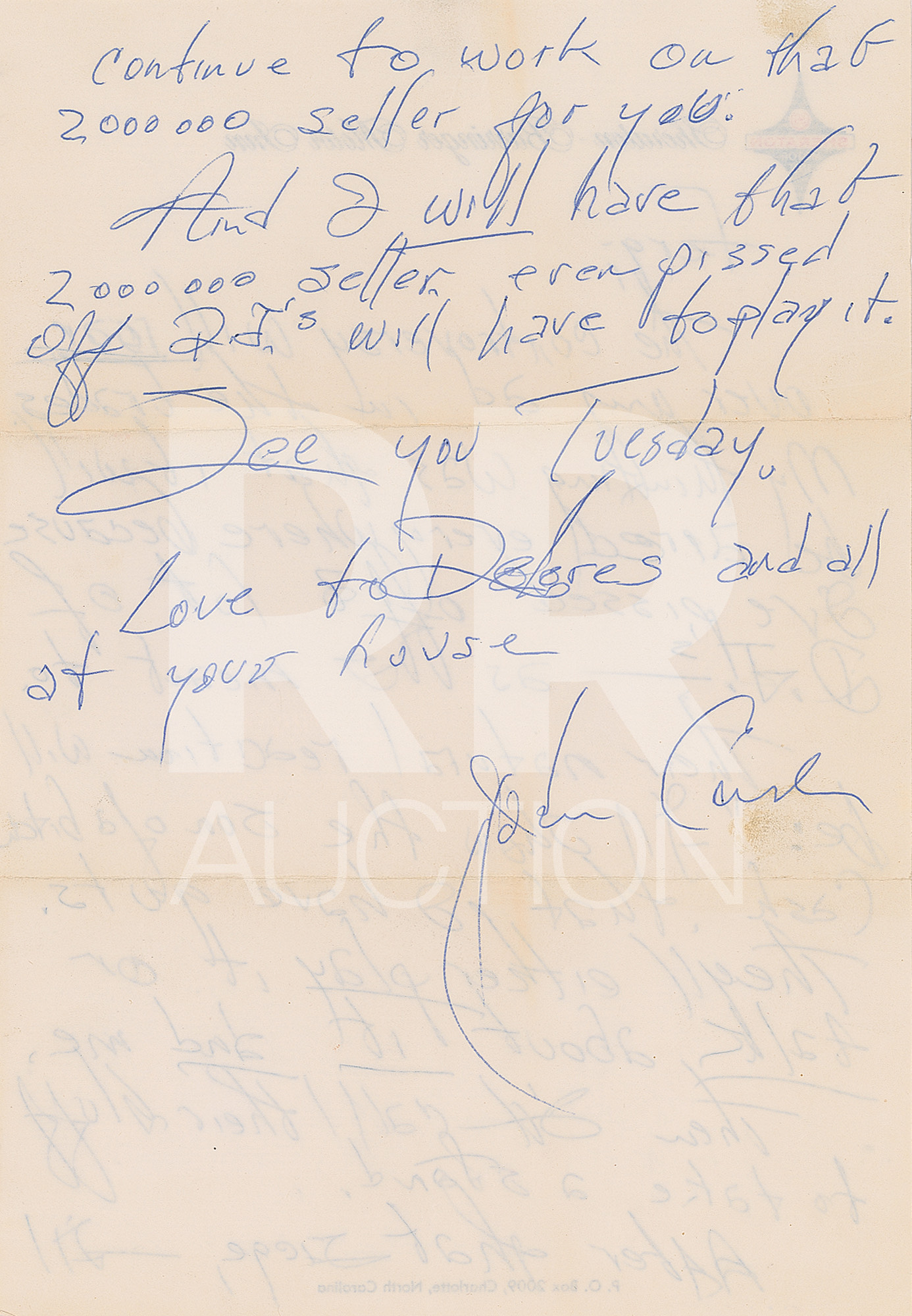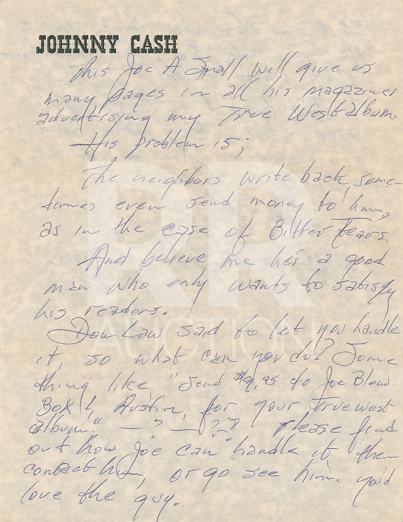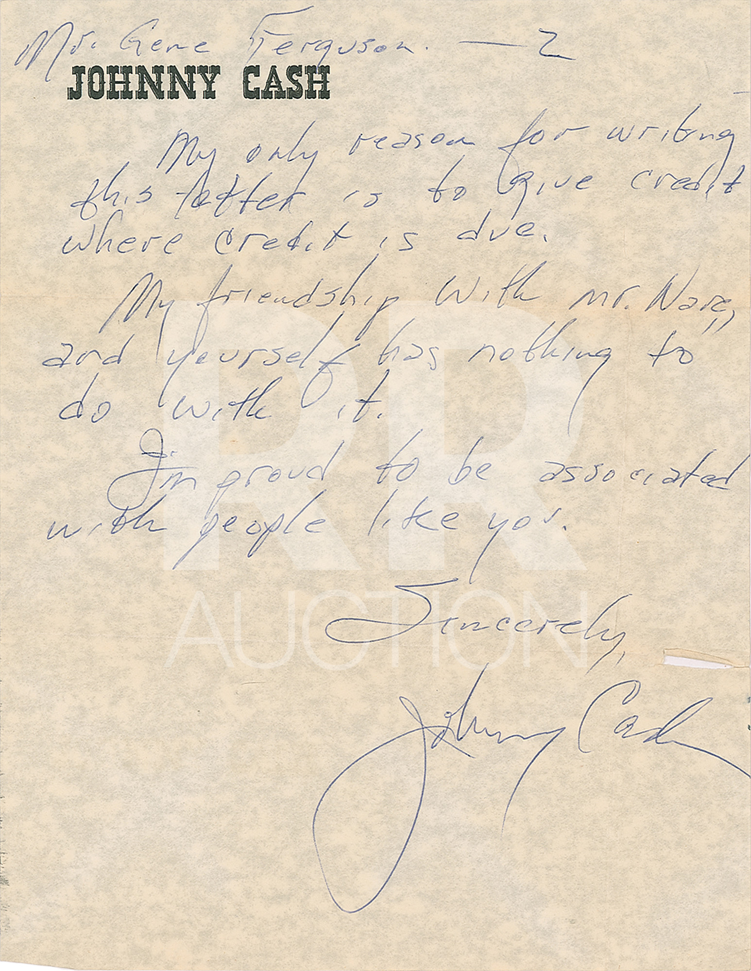 April 25, 1965, written from Kansas City on his personal letterhead, in part: “I would like to put in my two cents worth of commendation for Mr. Ware, ‘your man in Kansas City.’ he came to our show, and was completely 100% occupied with promoting this Columbia artist and product. I consider him ‘My friend in Kansas City,’ and please know that he has the utmost respect for yourself and your abilities.” Includes the original hand-addressed “Johnny Cash” mailing envelope.