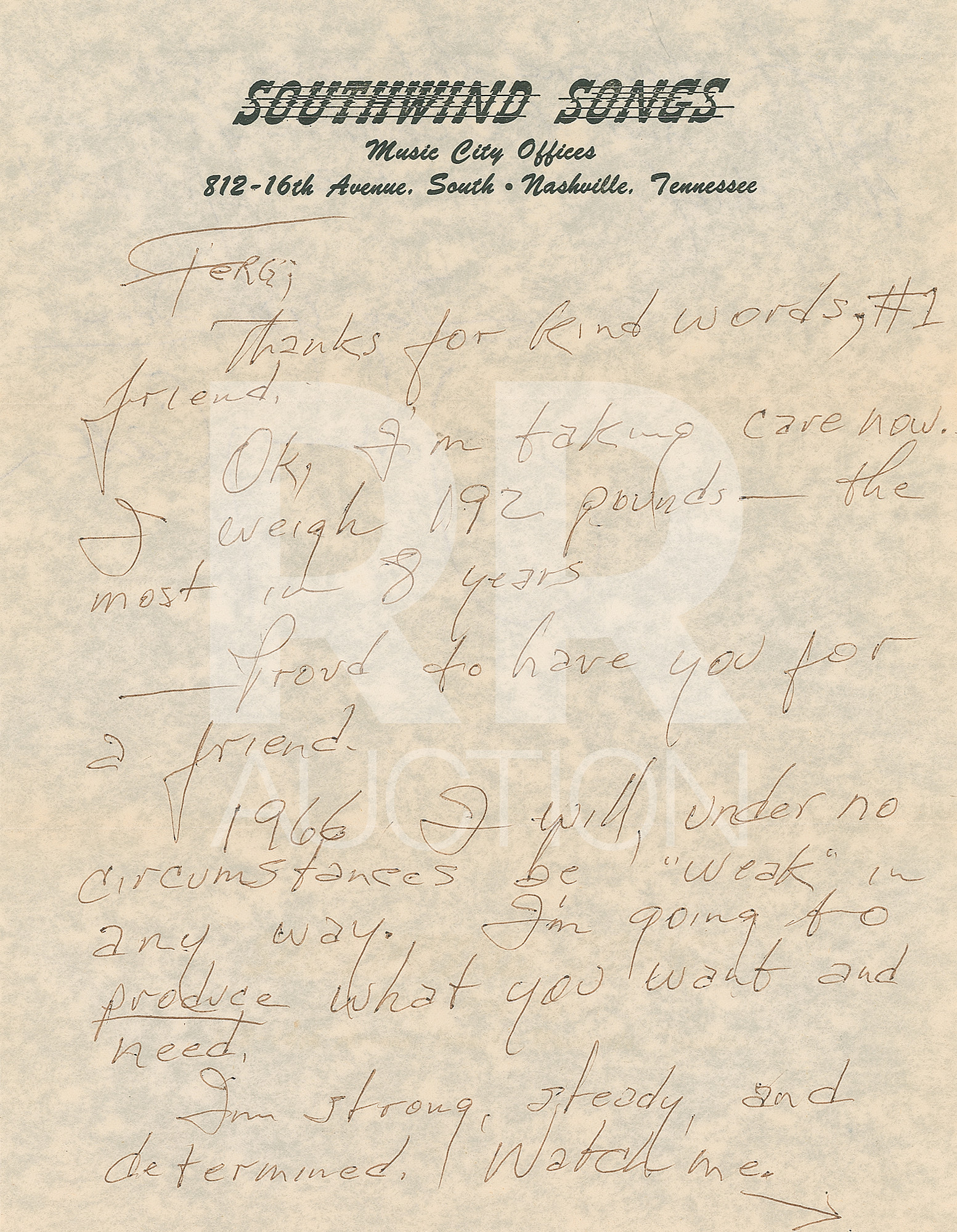 October 23, 1965, written from “Home” on “Southwind Songs” letterhead, in part: “Thanks for kind words, #1 friend. Ok, I’m taking care now. I weigh 192 pounds—the most in 8 years—proud to have you for a friend. 1966 I will, under no circumstances be ‘weak’ in any way. I’m going to produce what you want and need. I’m strong, steady, and determined. Watch me.” Includes the original hand-addressed “Johnny Cash” mailing envelope.