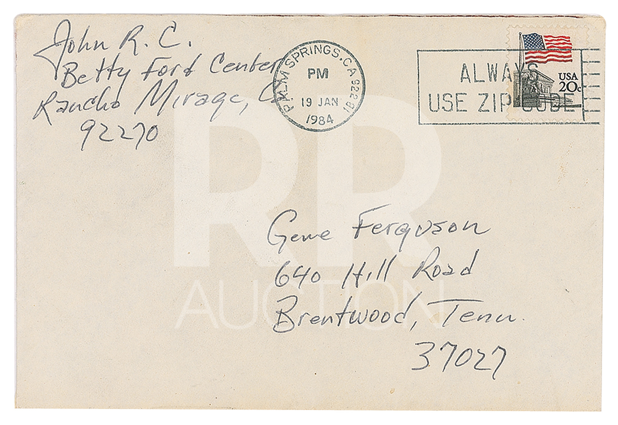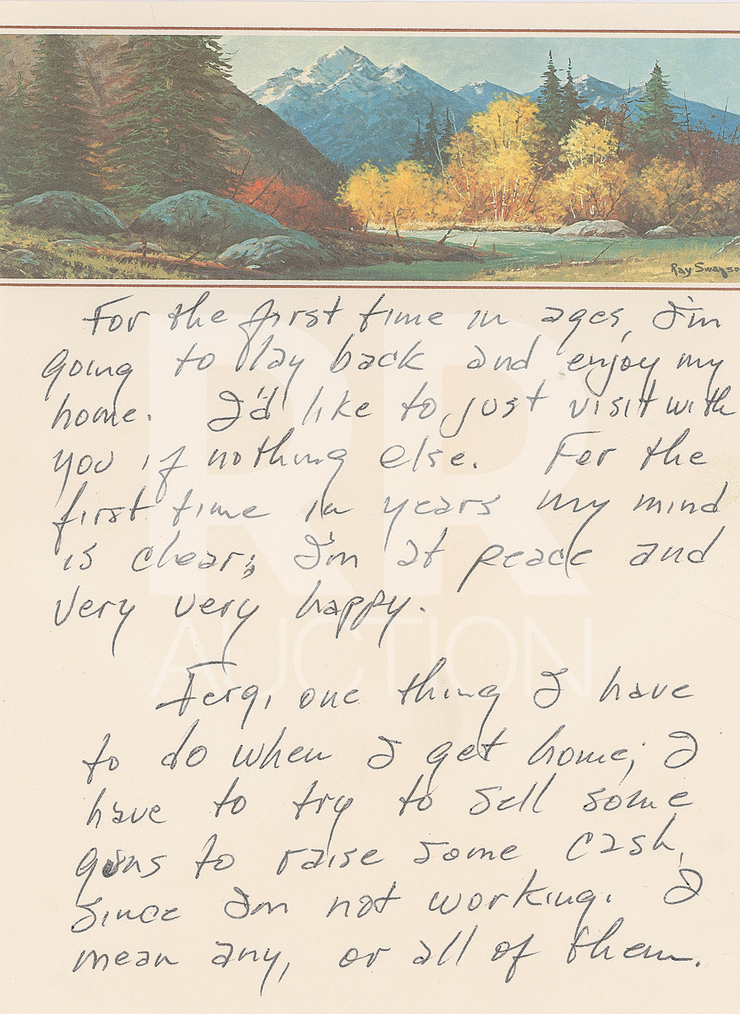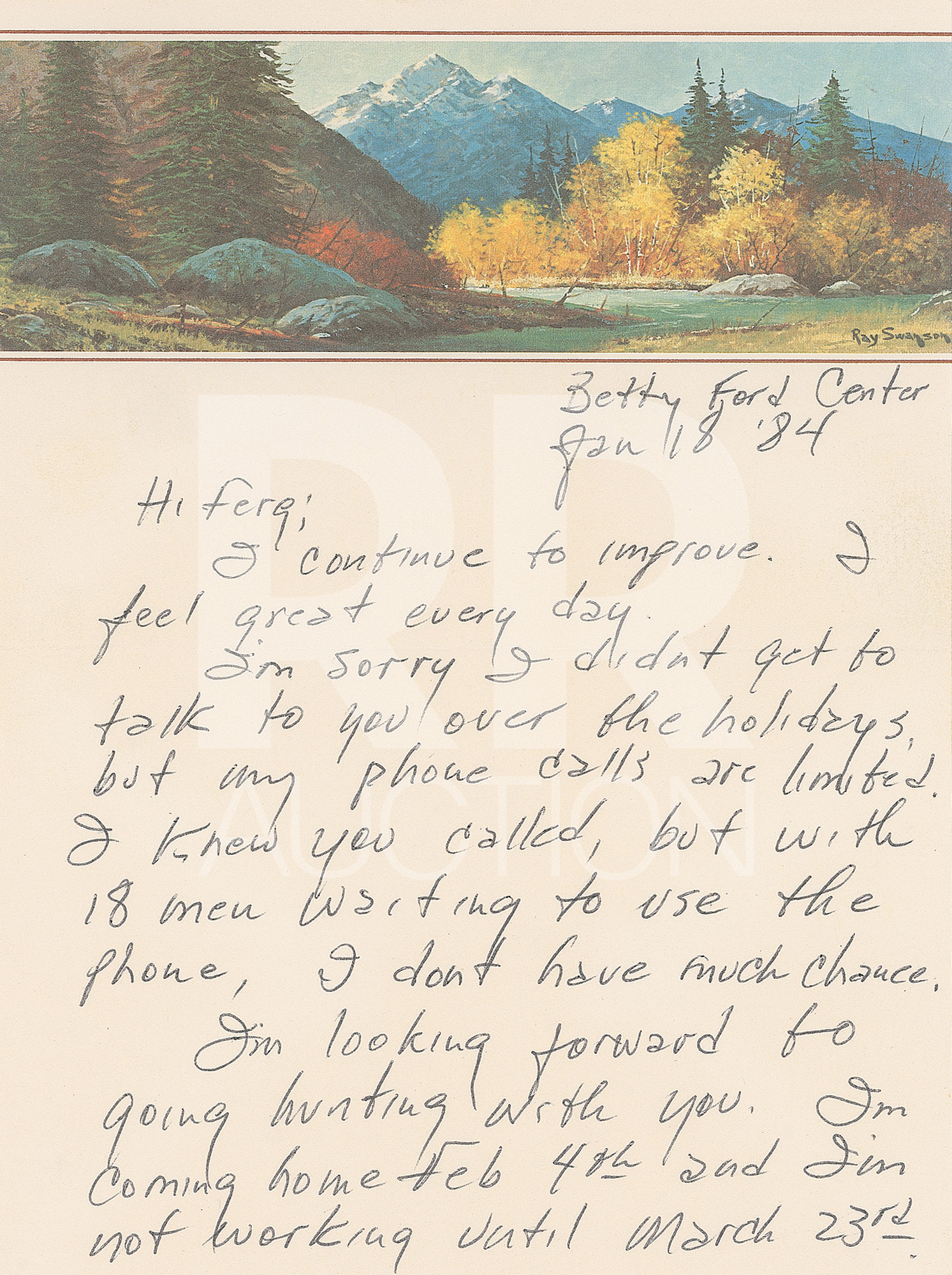 January 18, 1984, written from the “Betty Ford Center” on Ray Swanson illustrated letterhead, in full: “I continue to improve. I feel great everyday. I’m sorry I didn’t get to talk to you over the holidays, but my phone calls are limited. I knew you called, but with 18 men waiting to use the phone, I don’t have much chance. I’m looking forward to going hunting with you. I’m coming home Feb 4th and I’m not working until March 23rd. For the first time in ages, I’m going to lay back and enjoy my home. I’d like to just visit with you if nothing else. For the first time in years my mind is clear; I’m at peace and very very happy. Ferg, one thing I have to do when I get home; I have to try to sell some guns to raise some cash, since I’m not working. I mean any, or all of them. Maybe you’ve got some ideas about how I could go about a sale. Maybe you’d be interested in making a few dollars by helping me sell them? We’ll talk about it as soon as I get back. Meanwhile my love to Dolores and the boys.” Includes the original hand-addressed mailing envelope, with Cash incorporating his autograph, “John R. C.,” in the return address field.