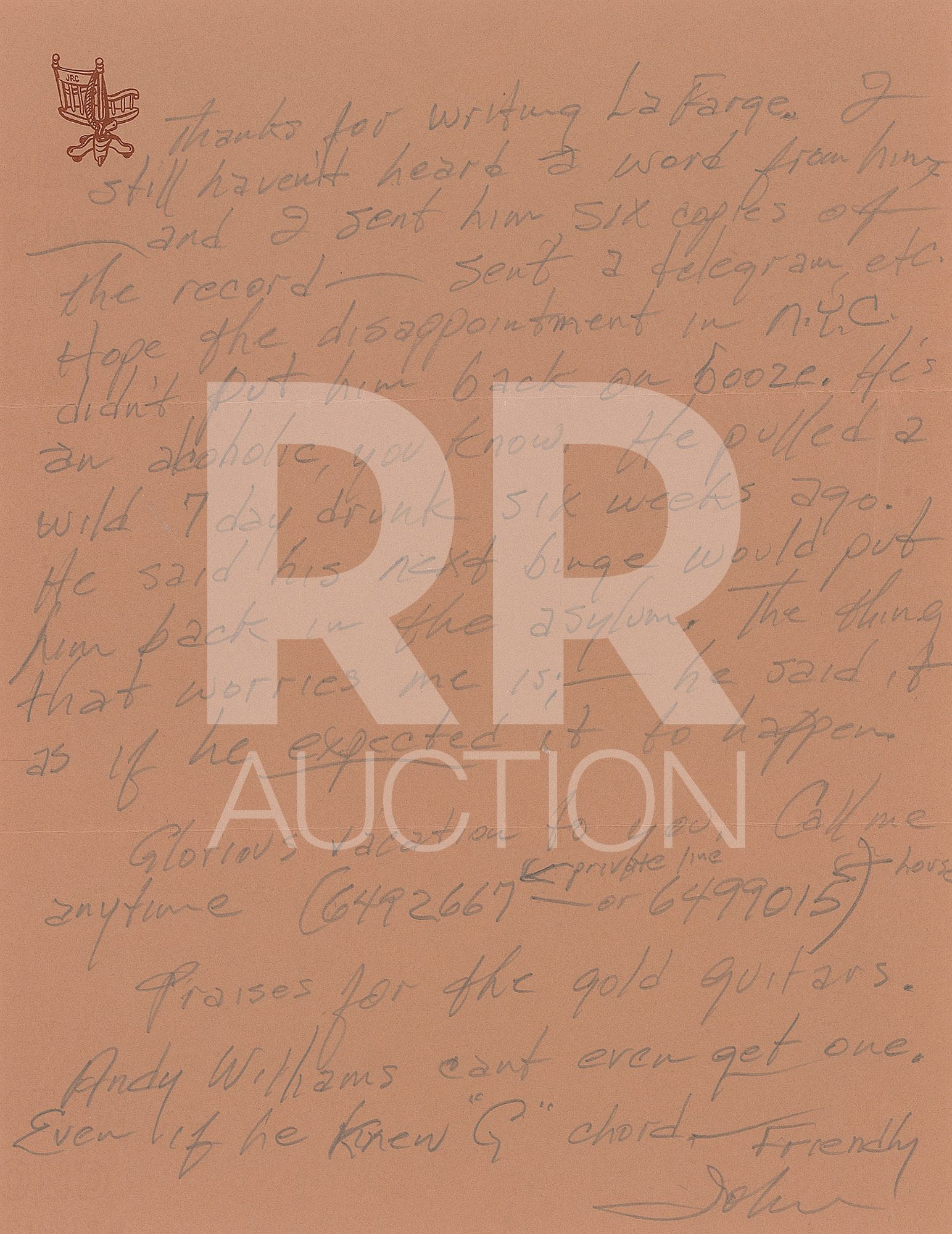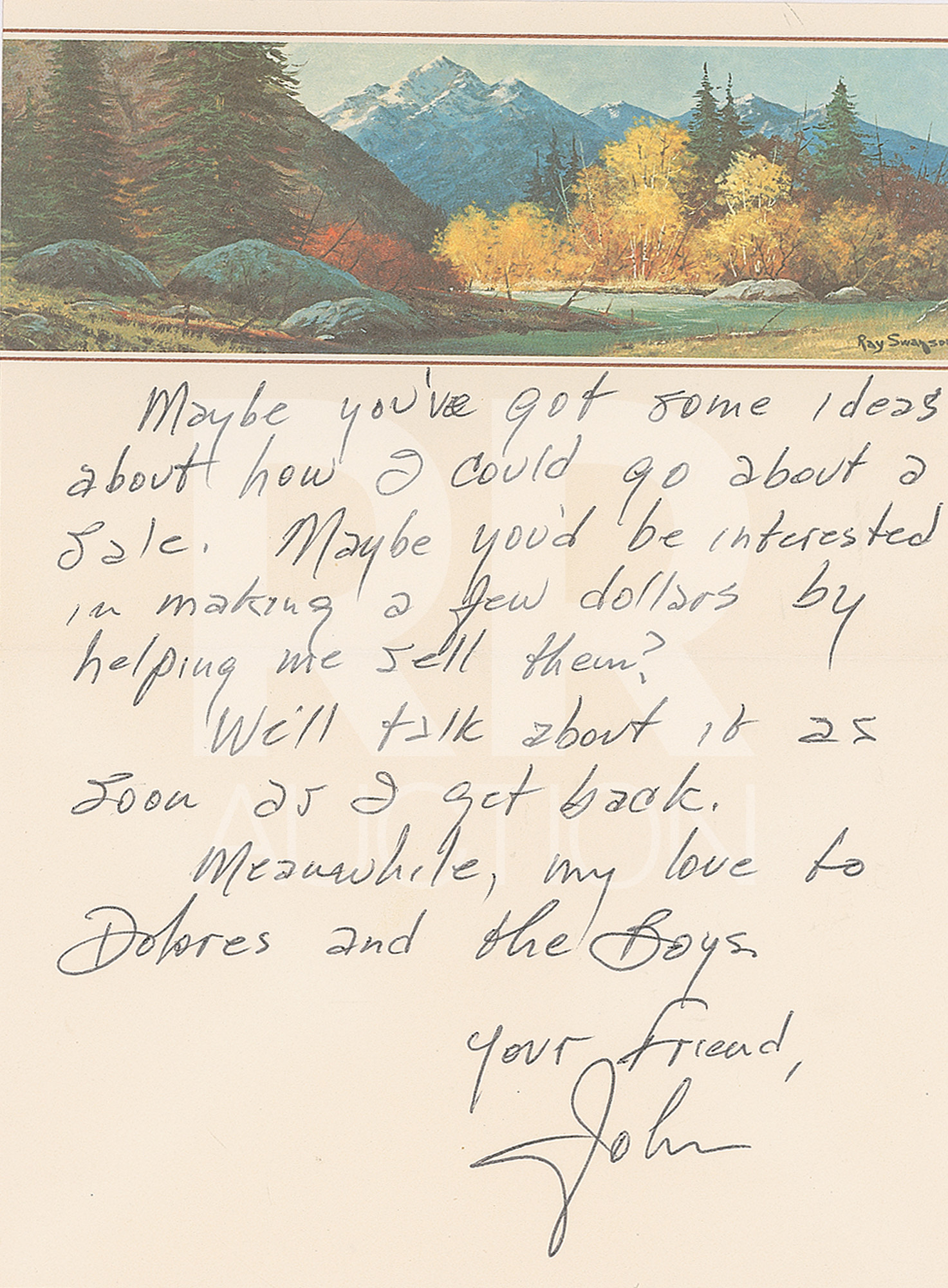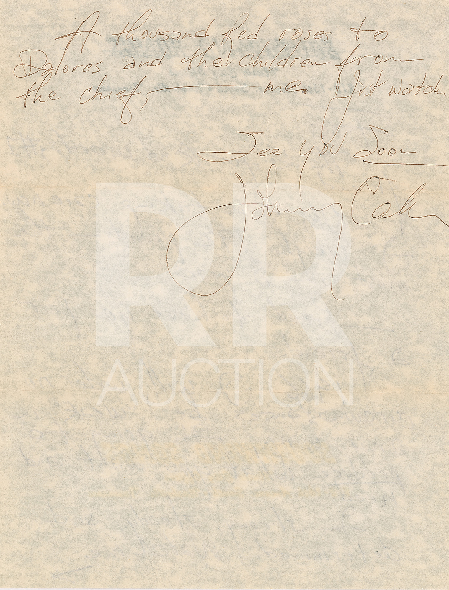 January 18, 1984, written from the “Betty Ford Center” on Ray Swanson illustrated letterhead, in full: “I continue to improve. I feel great everyday. I’m sorry I didn’t get to talk to you over the holidays, but my phone calls are limited. I knew you called, but with 18 men waiting to use the phone, I don’t have much chance. I’m looking forward to going hunting with you. I’m coming home Feb 4th and I’m not working until March 23rd. For the first time in ages, I’m going to lay back and enjoy my home. I’d like to just visit with you if nothing else. For the first time in years my mind is clear; I’m at peace and very very happy. Ferg, one thing I have to do when I get home; I have to try to sell some guns to raise some cash, since I’m not working. I mean any, or all of them. Maybe you’ve got some ideas about how I could go about a sale. Maybe you’d be interested in making a few dollars by helping me sell them? We’ll talk about it as soon as I get back. Meanwhile my love to Dolores and the boys.” Includes the original hand-addressed mailing envelope, with Cash incorporating his autograph, “John R. C.,” in the return address field.