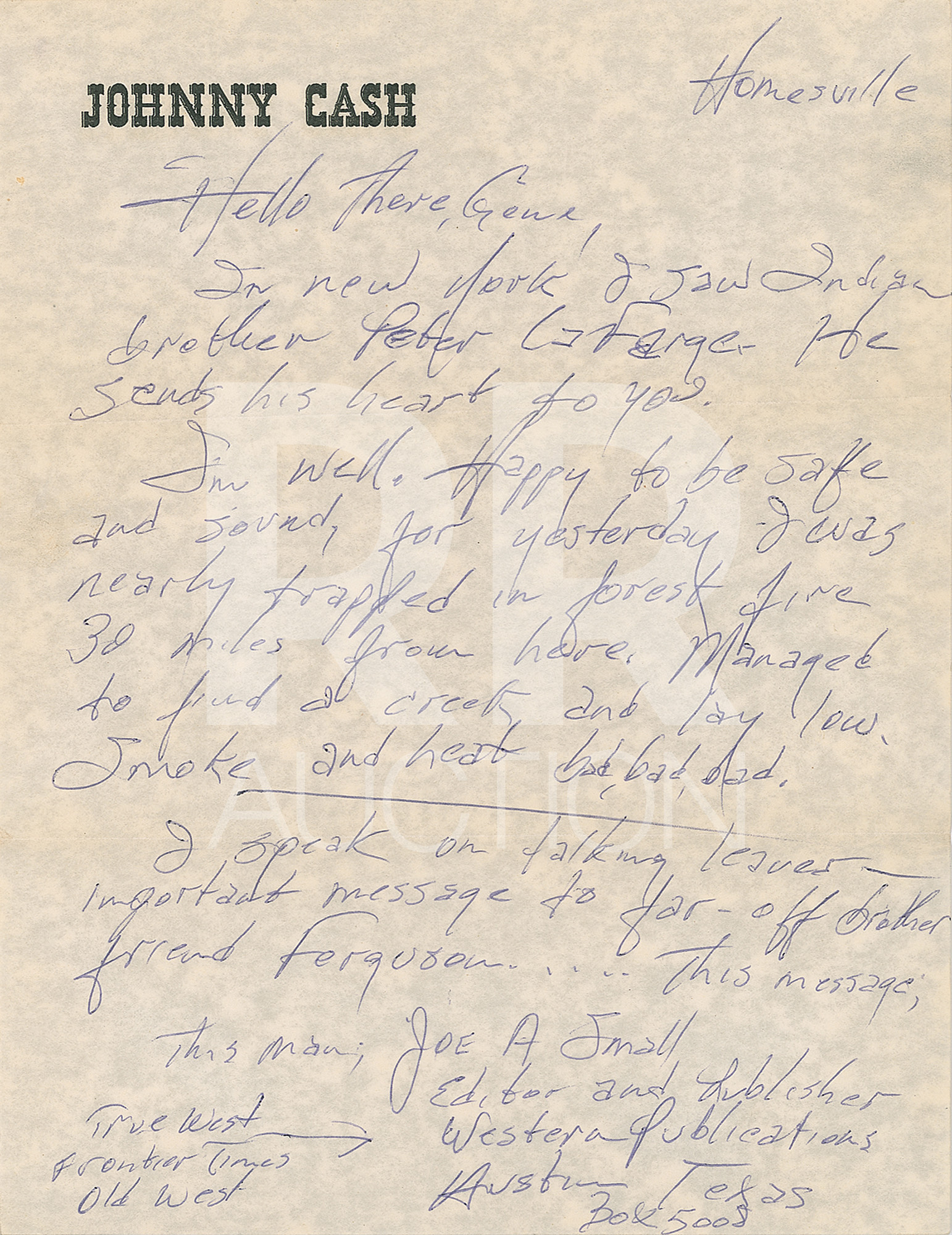 July 13, 1965, written from “Homesville” on his personal letterhead, in part: “In New York I saw Indian brother Peter La Farge. He sends his heart to you. I’m well. Happy to be safe and sound, for yesterday I was nearly trapped in forest fire 30 miles from here. Managed to find a creek and lay low. Smoke and heat bad, bad, bad…This Joe. A. Small will give us many pages in all his magazine advertising my True West album. His problem is; The neighbors write back, sometimes even send money to him, as in the case of Bitter Tears…Don Law said to let you handle it, so what can you do?” Includes the original hand-addressed “Johnny Cash” mailing envelope.