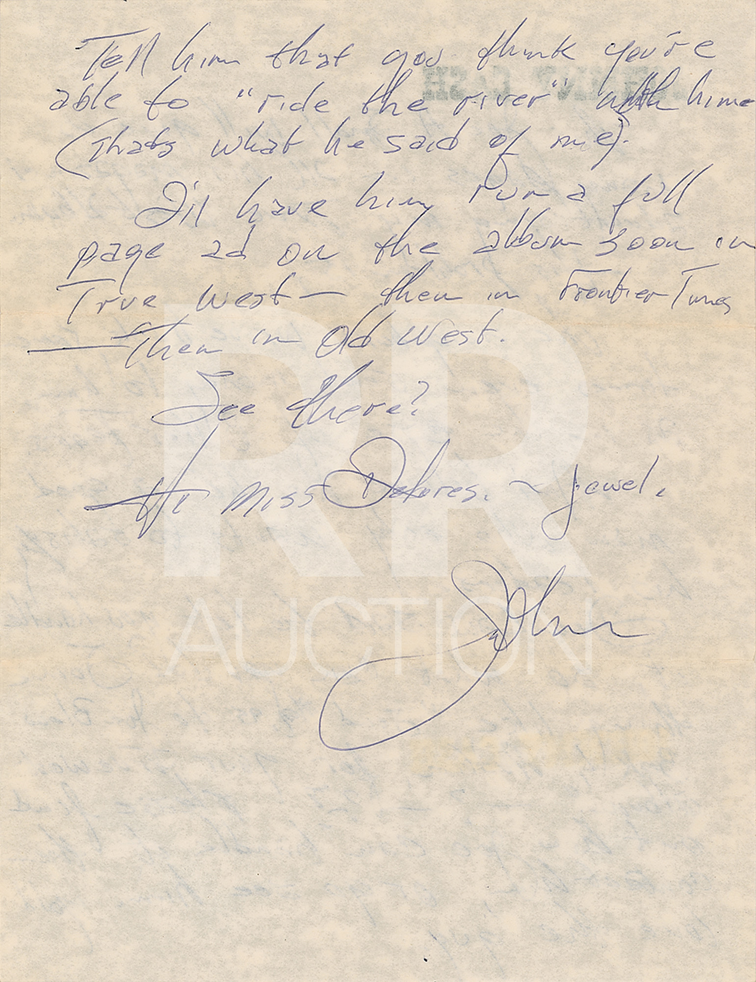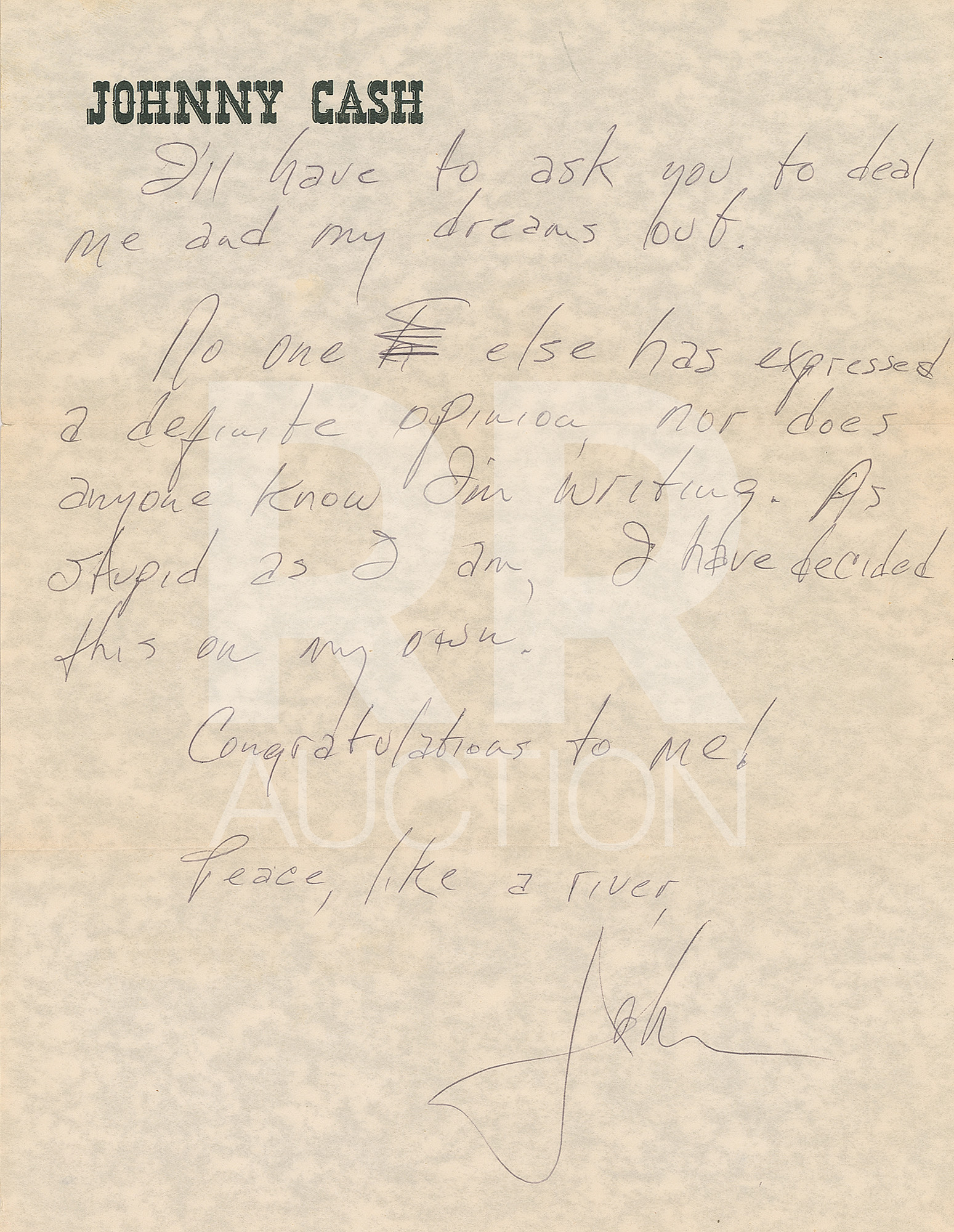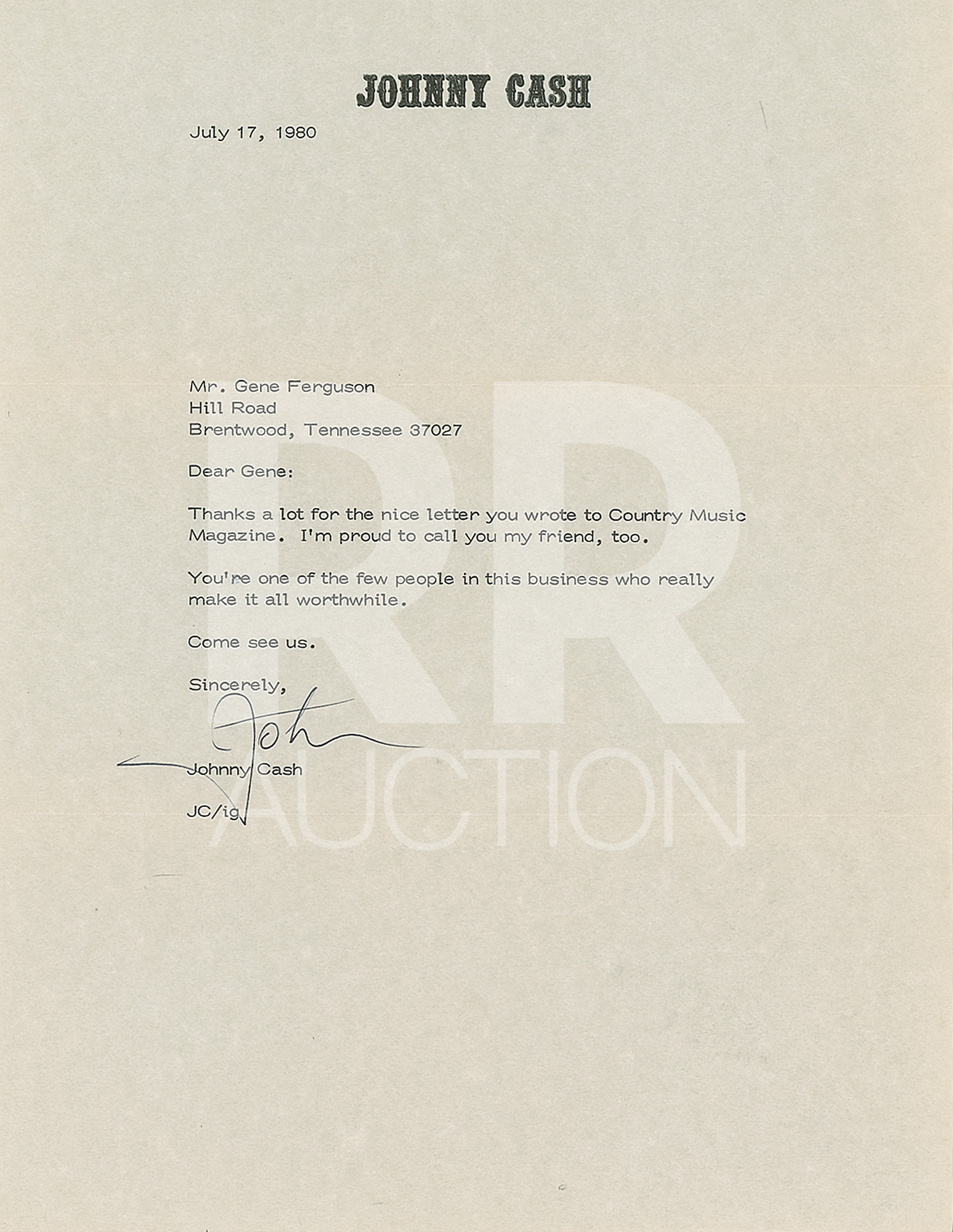 July 17, 1980, a TLS written on his personal letterhead, in full: “Thanks a lot for the nice letter you wrote to Country Music Magazine. I’m proud to call you my friend, too. You’re one of the few people in this business who really make it all worthwhile. Come see us.” Includes the original “Johnny Cash” mailing envelope.