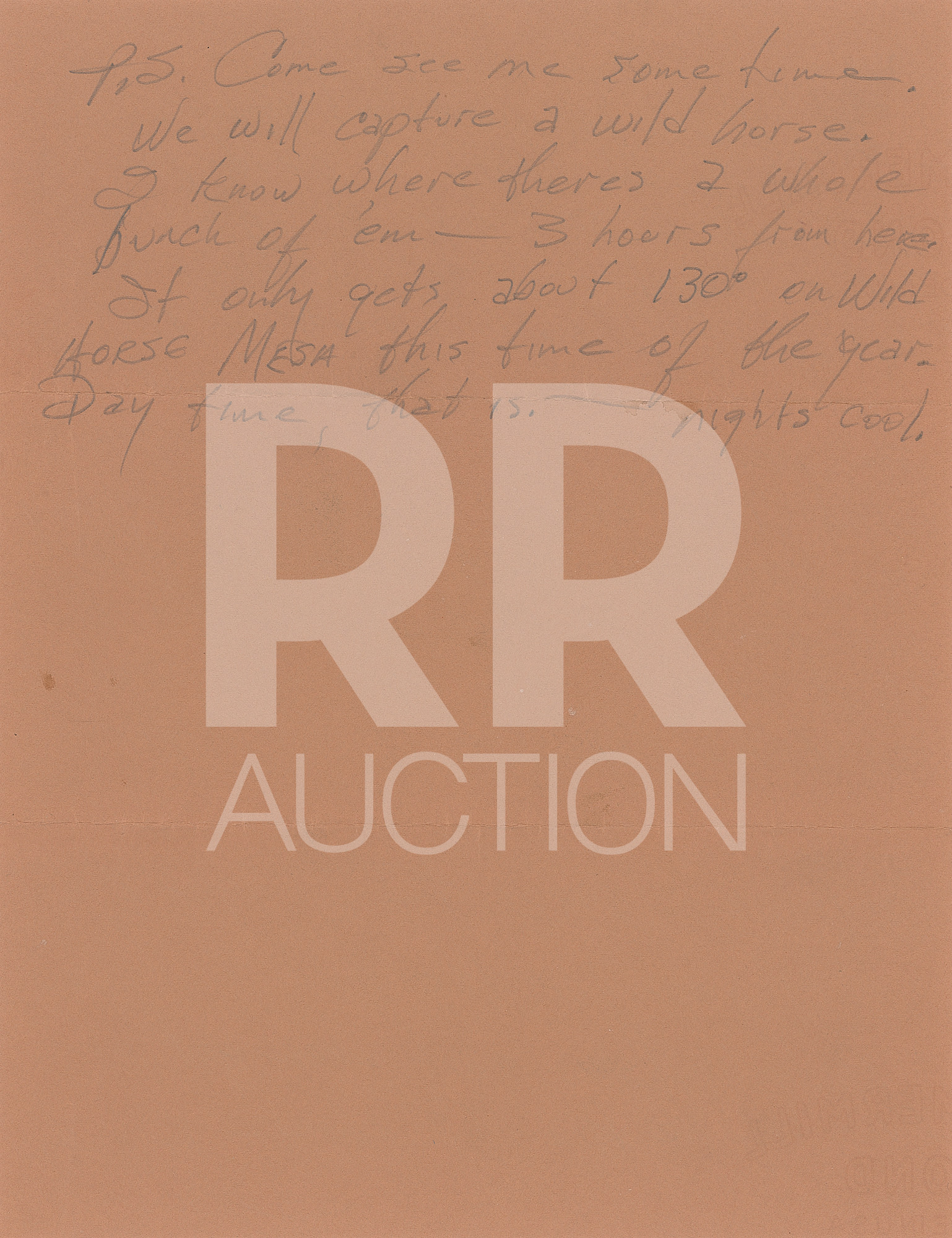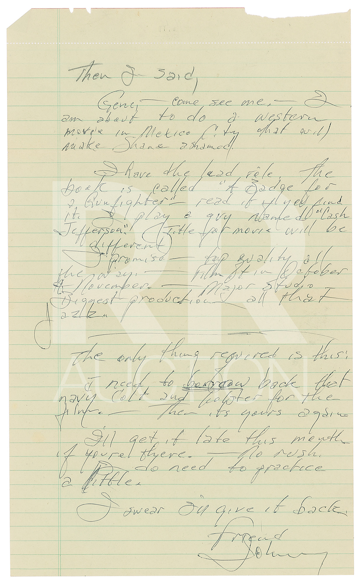 The final letter, undated, penned on an 8.5 x 14 sheet of notebook paper, in full: “Gene,—come see me—I am about to do a Western movie in Mexico City that will make Shane shamed. I have the lead role. The book is called ‘A Badge for a Gunfighter’—read it if you find it. I play a guy named ‘Cash Jefferson.’ Title for movie will be different. I promise—top quality all the way—Film it in October & November—Major studio—Biggest production—all that jazz. The only thing is this: I need to borrow back that Navy Colt and holster for the film—Then it’s yours again. I’ll get it late this month if you’re there—No rush. I do need to practice a little. I swear I’ll give it back.” In overall fine condition.