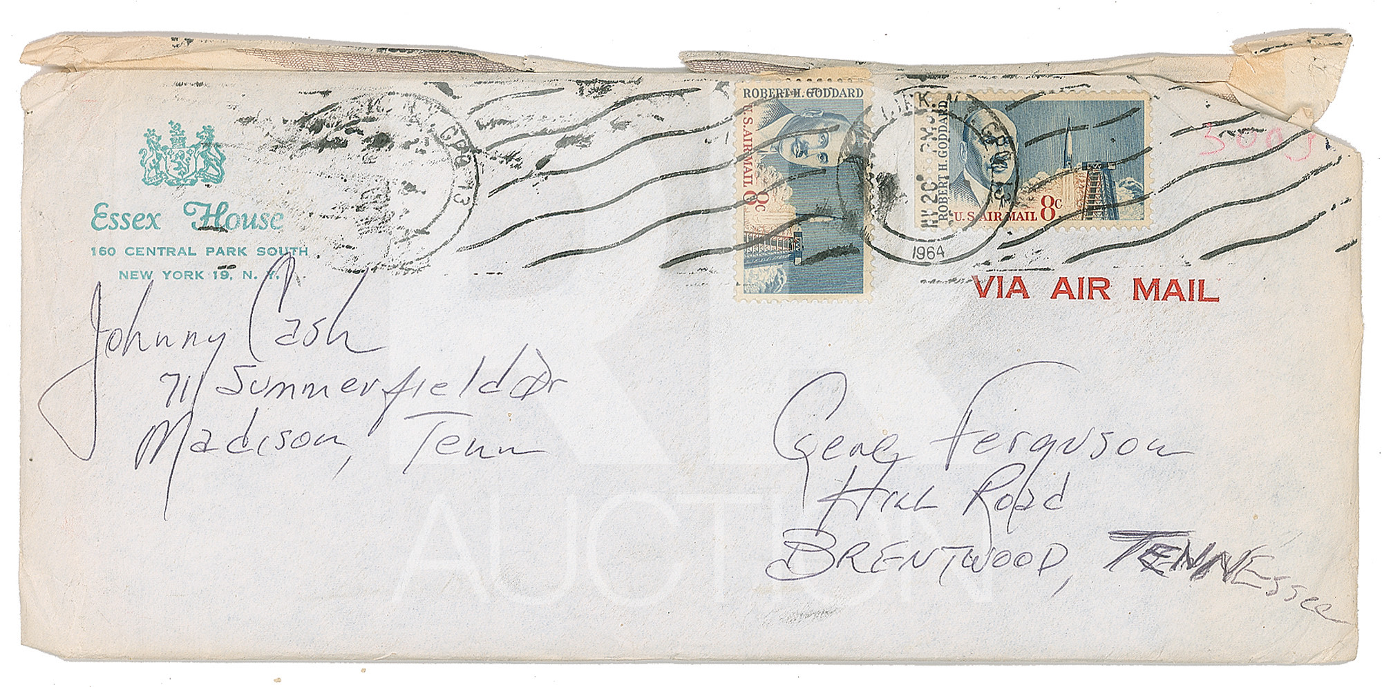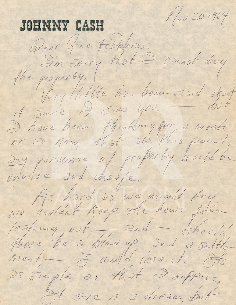 November 20, 1964, written from Madison, Tennessee, on his personal letterhead, in part: “Very little has been said about it since I saw you—but I have been thinking for a week or so now, that at this point, any purchase of property would be unwise and unsafe. As hard as we might try, we couldn’t keep the news from leaking out,—and—should there be a blow-up and a settlement—I would lose it…No one else has expressed a definite opinion, nor does anyone know I’m writing. As stupid as I am, I have decided this on my own. Congratulations to me!” Includes the original hand-addressed mailing envelope, with Cash incorporating his autograph in the return address field.