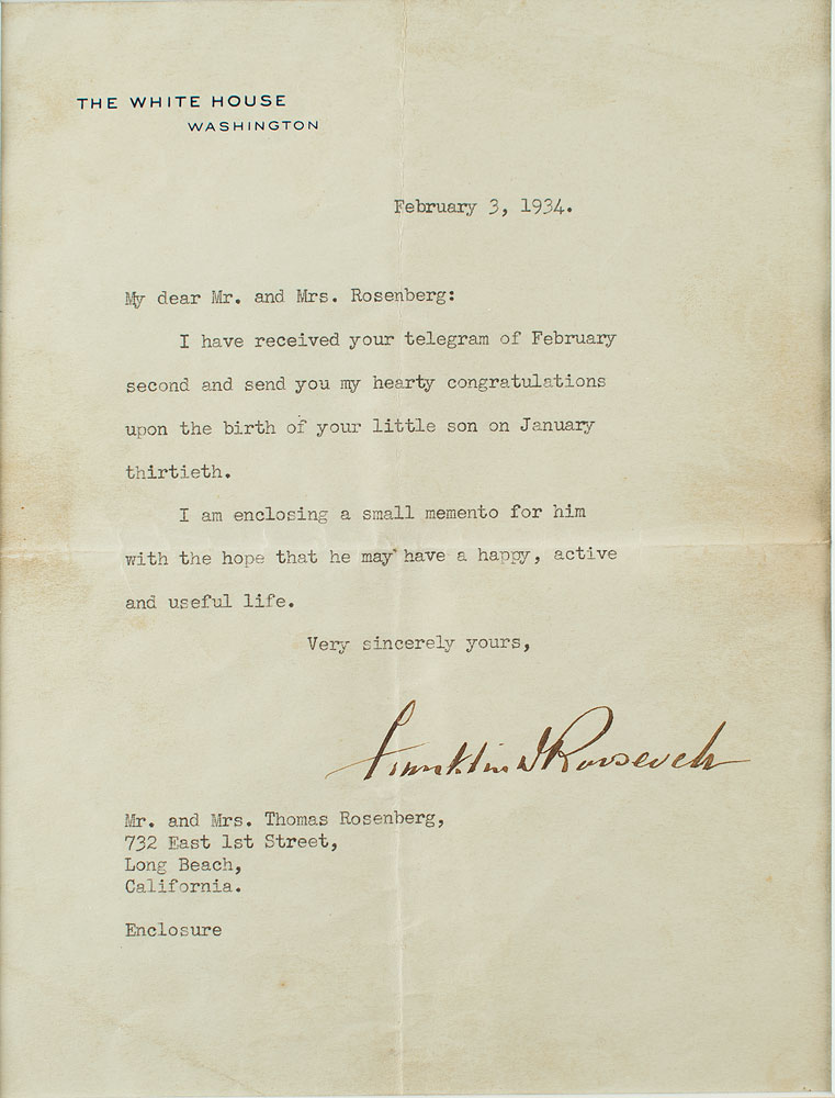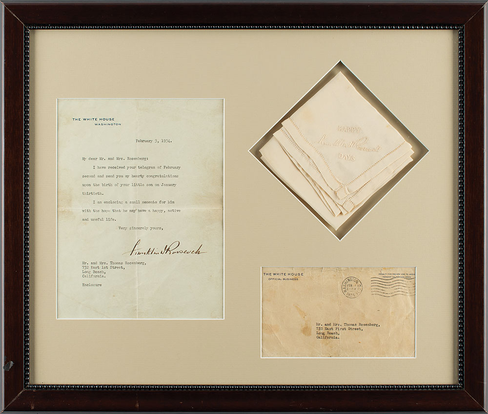 TLS as president, one page, 6.5 x 8.5, White House letterhead, February 3, 1934. Letter to Mr. and Mrs. Thomas Rosenberg, in full: "I have received your telegram of February second and send you my hearty congratulations upon the birth of your little son on January thirtieth. I am enclosing a small memento for him with the hope that he may have a happy, active and useful life." Matted with the original White House mailing envelope and a folded cream-colored handkerchief with lettering: "Happy / Franklin D. Roosevelt / Days"; framed to an overall size of 19 x 16. In very good condition, with intersecting folds, creasing, and soiling to the letter.