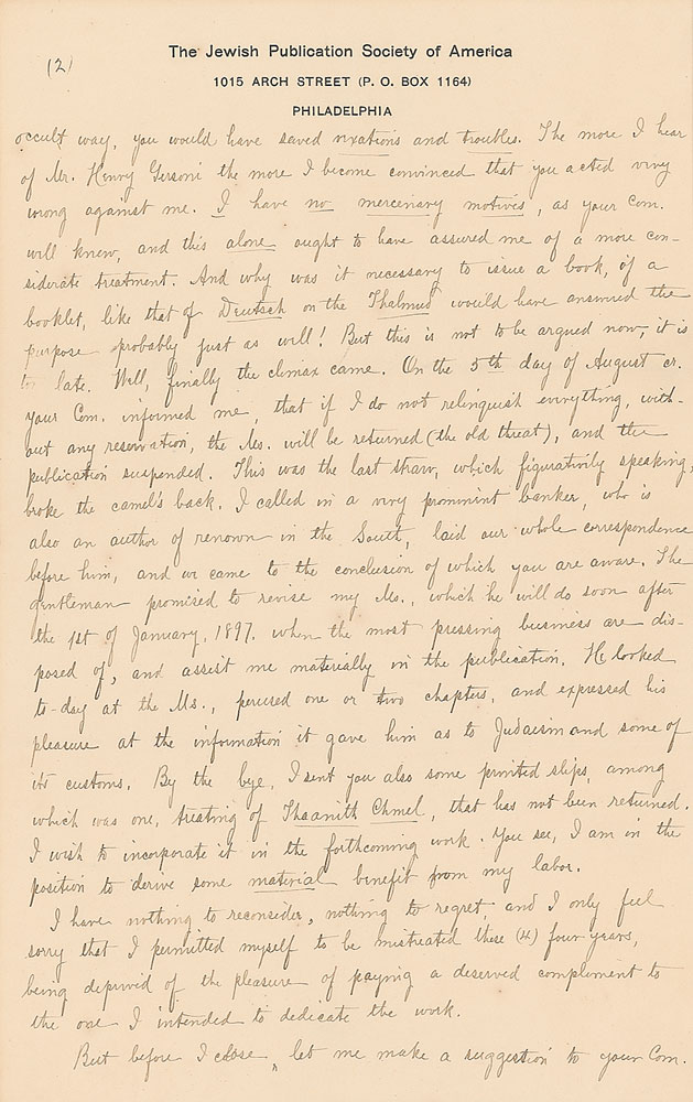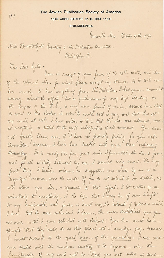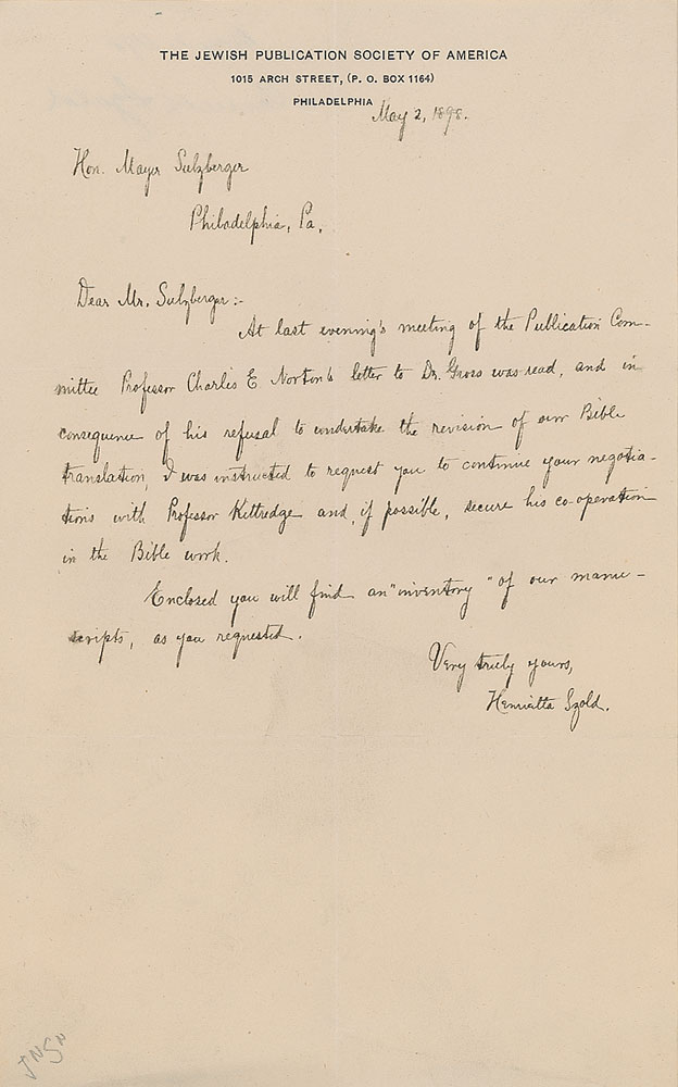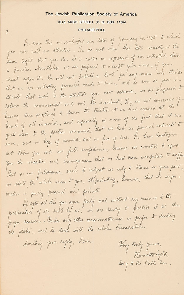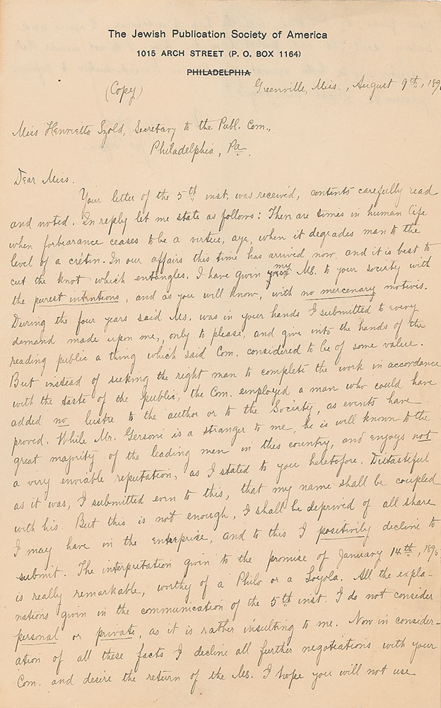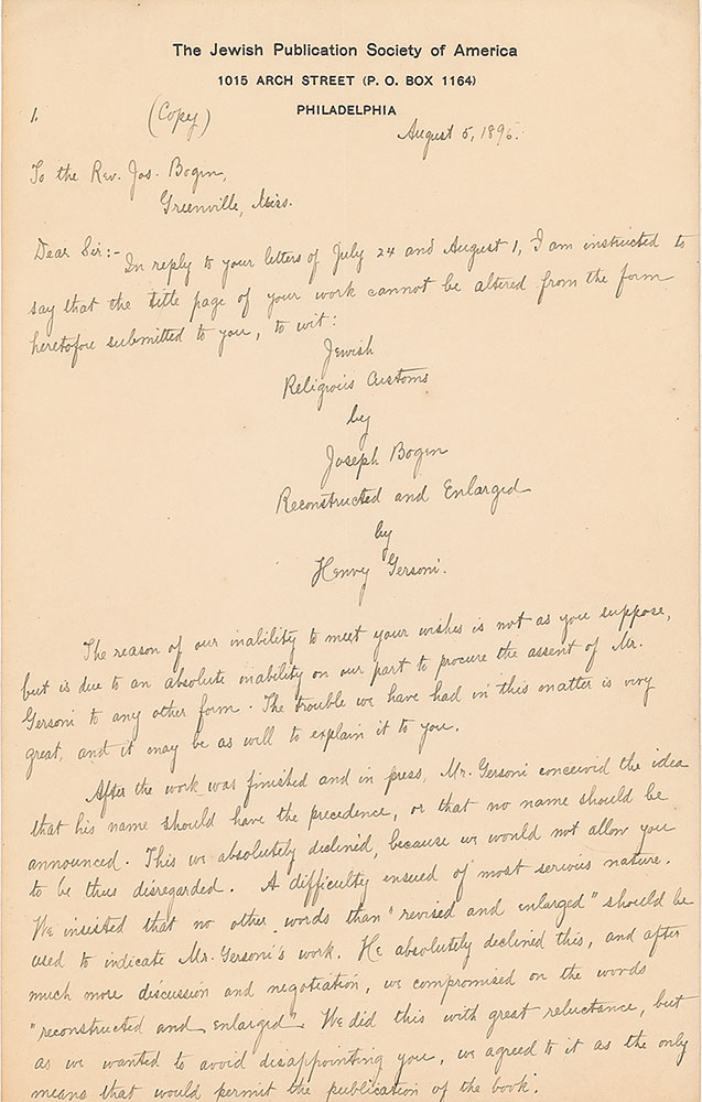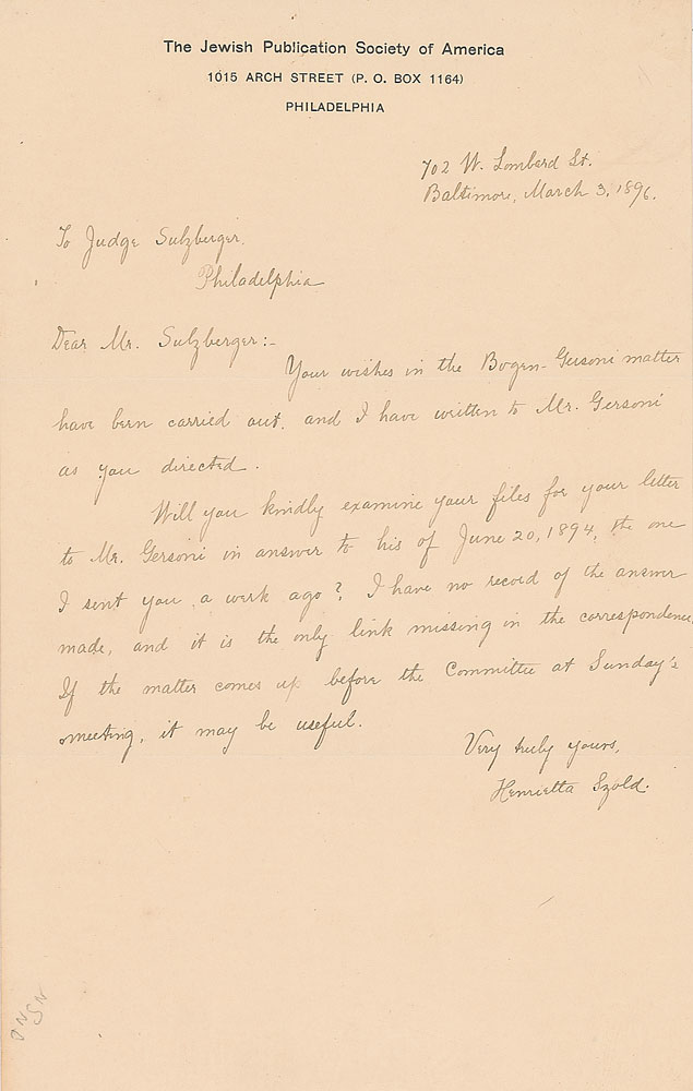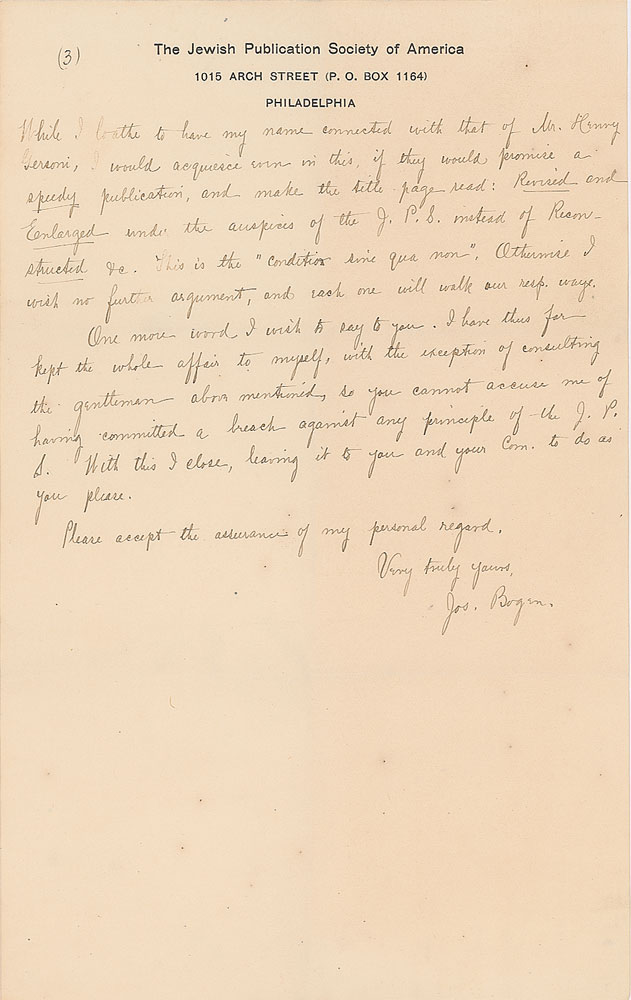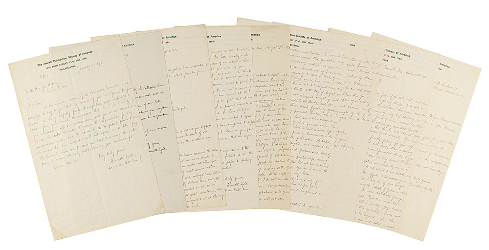 Collection of six ALSs and handwritten copies of letters sent to her, all signed at the beginning or end, totaling nine pages, 6 x 9.5, The Jewish Publication Society of America letterhead, dated from 1895-1898. The letters mostly pertain to the publication of a book to be entitled "Jewish Religious Customs by Joseph Bogen, Reconstructed and Enlarged by Henry Gersoni," and the ensuing dispute over the authors' precedence in the title. In very good to fine condition, with creasing and intersecting folds.