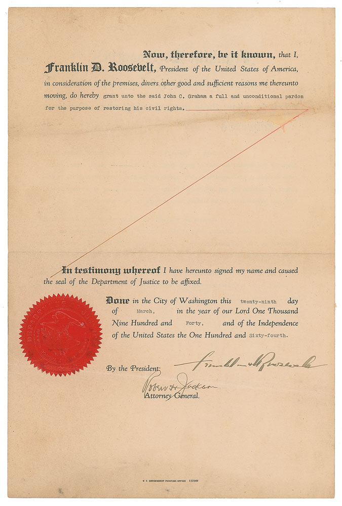 Partly-printed DS as president, one page both sides, 9 x 13.5, March 29, 1940. President Roosevelt pardons a postal embezzler, in part: "John C. Graham pleaded guilty in the United States District Court for the Eastern District of South Carolina to embezzling postal funds, making false entries in his record books and reports to the Post Office Department?Whereas it has been made to appear to me that the said John C. Graham, since his discharge from imprisonment, has been conducting himself in a law-abiding manner?I, Franklin D. Roosevelt, President of the United States of America?do hereby grant unto the said John C. Graham a full and unconditional pardon for the purpose of restoring his civil rights." Boldly signed at the conclusion by Franklin D. Roosevelt, and countersigned by Attorney General Robert H. Jackson. In fine condition, with three horizontal folds. Just the fourth FDR pardon we have offered.