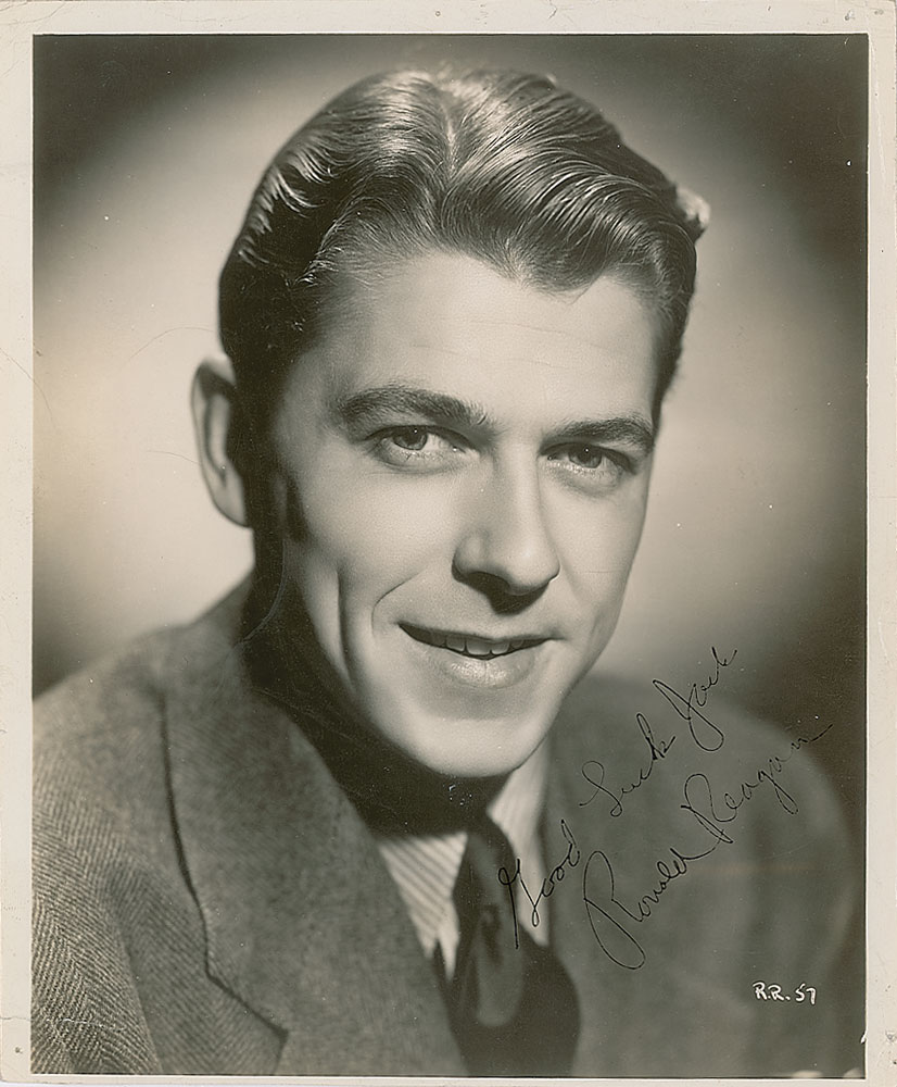 Vintage glossy 8 x 9.5 photo of Reagan from his Hollywood days, signed and inscribed in fountain pen, "Good Luck Jack, Ronald Reagan.” In very good to fine condition, with scattered light creasing a trimmed bottom border, and tack holes to the edges. Accompanied by a full letter of authenticity from JSA.