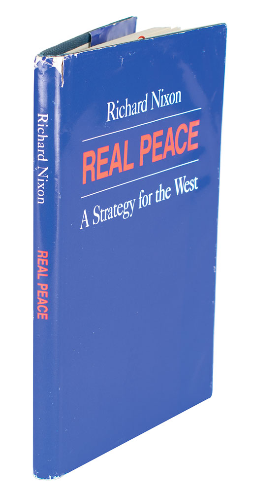 Signed book: Real Peace: A Strategy for the West. First edition, first printing. NY: Privately printed, 1983. Hardcover with dust jacket, 5.75 x 8.5, 106 pages. Signed on the first free end page in blue felt tip by Richard Nixon. Paperclipped to the front flap of the jacket is a slip noting that this copy "from the author's private edition, is one of a limited number being sent to community leaders and opinion leaders around the United States." The book was then picked up and published in a trade edition by Little, Brown and Company in 1984. In very good to fine condition, with wear to the dust jacket.
