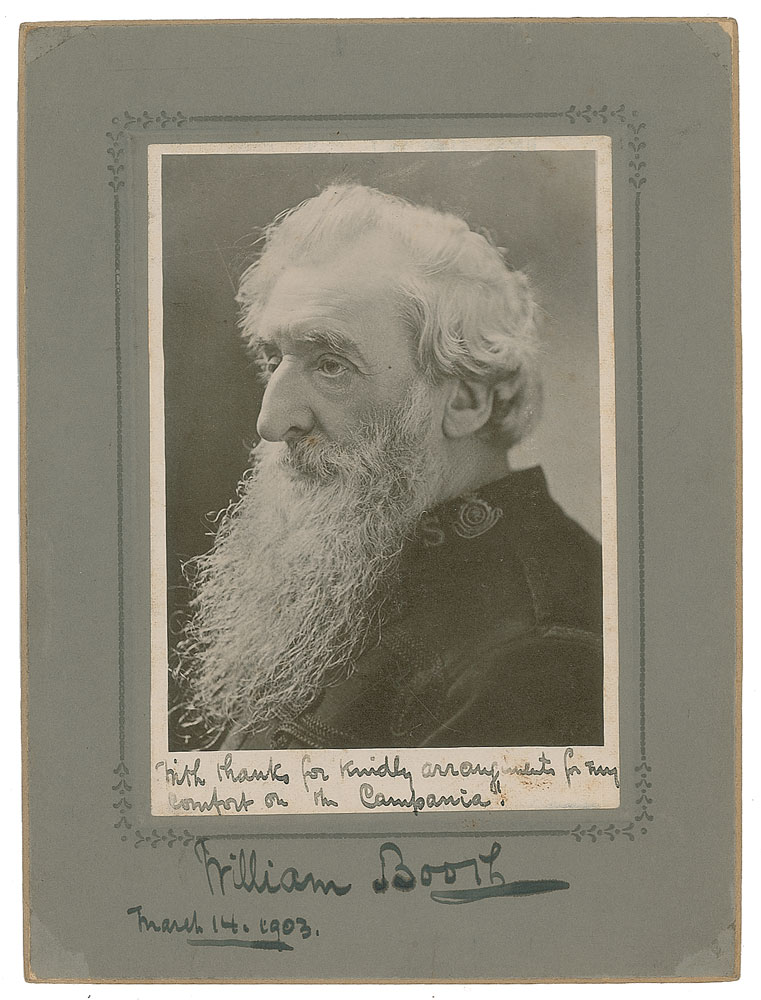 British minister and social reformer (1829-1912) best known as the founder of the Salvation Army. Scarce vintage matte-finish 3.75 x 5.5 portrait of William Booth in profile, affixed to the original 6 x 8 mount, signed in fountain pen, "With thanks for kindly arrangements for my comfort on the Campania. William Booth, March 14, 1903." In very good to fine condition, with surface loss to each corner tip of the mount.