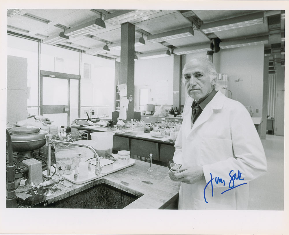 Glossy 10 x 8 photo of Salk in his laboratory, signed in blue felt tip. In very fine condition. Originally obtained by in-person specialist Mike Wehrmann.