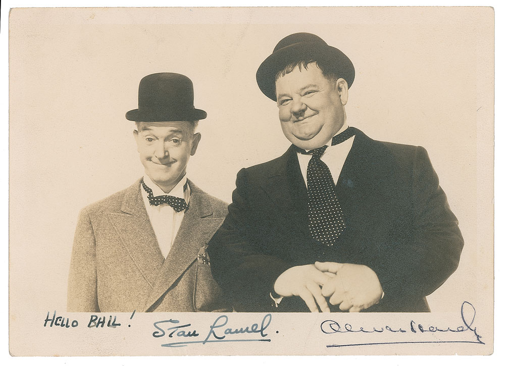 Vintage matte-finish 7 x 5 photo of the famed comedy duo side-by-side in their bowler hats, signed and inscribed in the lower border in fountain pen, "Hello Bill! Stan Laurel" and "Oliver Hardy.” In fine condition, with two light creases to the right side.