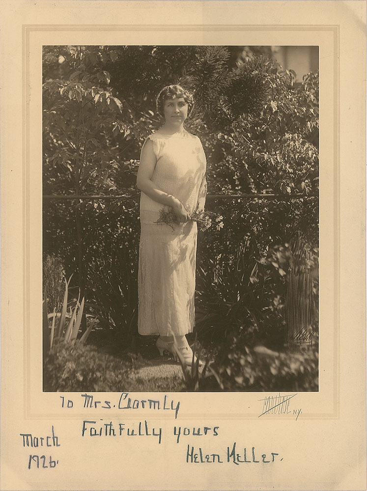 Vintage matte-finish 10 x 13.25 studio portrait of Hellen Keller standing outdoors in a lovely full-length pose, signed and inscribed in the lower border in pencil, "To Mrs. Gormly, Faithfully yours, Helen Keller, March 192.” Signed in the lower right by the photography studio. In fine condition.