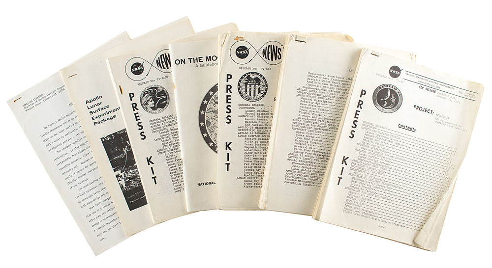 Grouping of five official NASA publications relating to Apollo missions 14, 15, 16, and 17, including: a stapled 108-page press kit entitled “Project: Apollo 14 (To be launched no earlier than Jan. 31),” January 11, 1971, Release No. 71-3K; a stapled 152-page press kit for the Apollo 15 mission, with front cover no longer present; a stapled 170-page press kit entitled “Project: Apollo 16 (To be launched no earlier than April 16)," March 22, 1972, Release No. 72-64K”; a 90-page booklet entitled “On the Moon with Apollo 16: A Guidebook to the Descartes Region,” written by Gene Simmons, April 1972 (EP-95); and a stapled 121-page press kit entitled “Project: Apollo 17 (To be launched no earlier than Dec. 6),” November 14, 1972, Release No. 72-220K. Also included is a stapled 4-page booklet from the Bendix Aerospace Systems Division entitled “ALSEP—The First 100 Days,” and a stapled 15-page booklet from Hamilton Standard, a Division of the United Aircraft Corporation, headed: “Project Apollo: Portable Life Support System.” In overall fine condition, with wear and creasing to edges and some rust to staples. From the collection of Tim Furniss, Flight International magazine’s spaceflight correspondent from 1984 to 2006, and author of over 35 published books on space history.