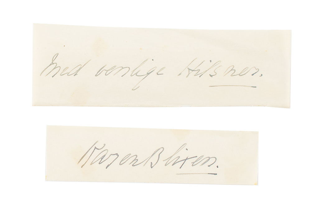 Pseudonym of prominent Danish author Karen Blixen (1885-1962), best known for her account of life in Kenya, Out of Africa, later adapted into an Academy Award-winning film. Fountain pen signature, "Karen Blixen,” on an off-white 4.5 x 1.25 slip. Also included is an off-white 5.5 x 1.75 slip with a handwritten salutation in Danish from Dinesen: "Med venlige hilsner [Best regards]." In fine condition, with some faint staining and light creasing.