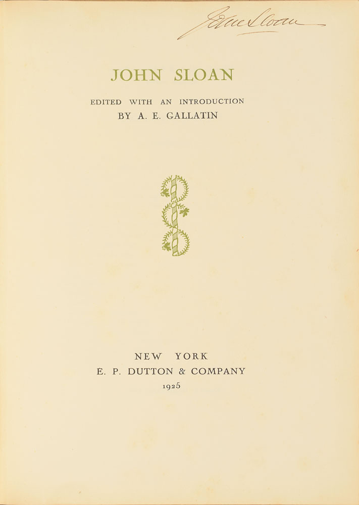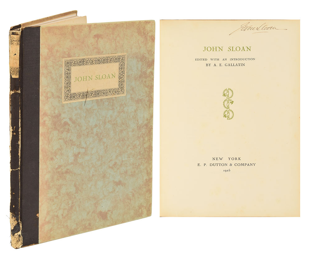 Esteemed American artist (1871-1951), one of the leading figures of the 'Ashcan' school, best known for his evocative renderings of urban America at the turn of the century. Signed book: John Sloan. First edition. NY: E. P. Dutton, 1925. Hardcover, 8 x 11. Signed on the title page in fountain pen by Sloan. In very good to fine condition, with damage and loss to the partially separated spine; interior pages are overall clean and fine.