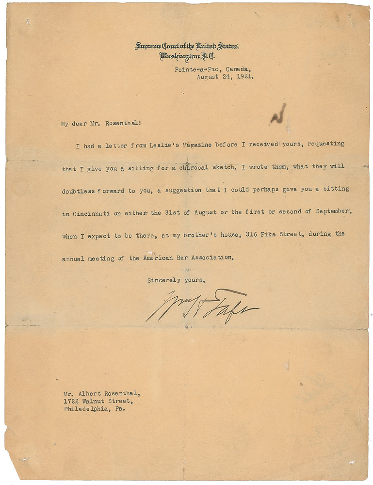 TLS signed “Wm. H. Taft,” one page, 8 x 10.5, Supreme Court of the United States letterhead, August 24, 1921. Letter to American painter Albert Rosenthal, in part: "I had a letter from Leslie's Magazine before I received yours, requesting that I give you a sitting for a charcoal sketch. I wrote them, what they will doubtless forward to you, a suggestion that I could perhaps give you a sitting in Cincinnati on either the 31st of August or the first or second of September, when I expect to be there, at my brother's house, 316 Pike Street, during the annual meeting of the American Bar Association." In very good condition, with creasing, tack holes, short edge tears, and old repairs to folds on the reverse. Accompanied by a print of the charcoal sketch, bearing a facsimile signature.