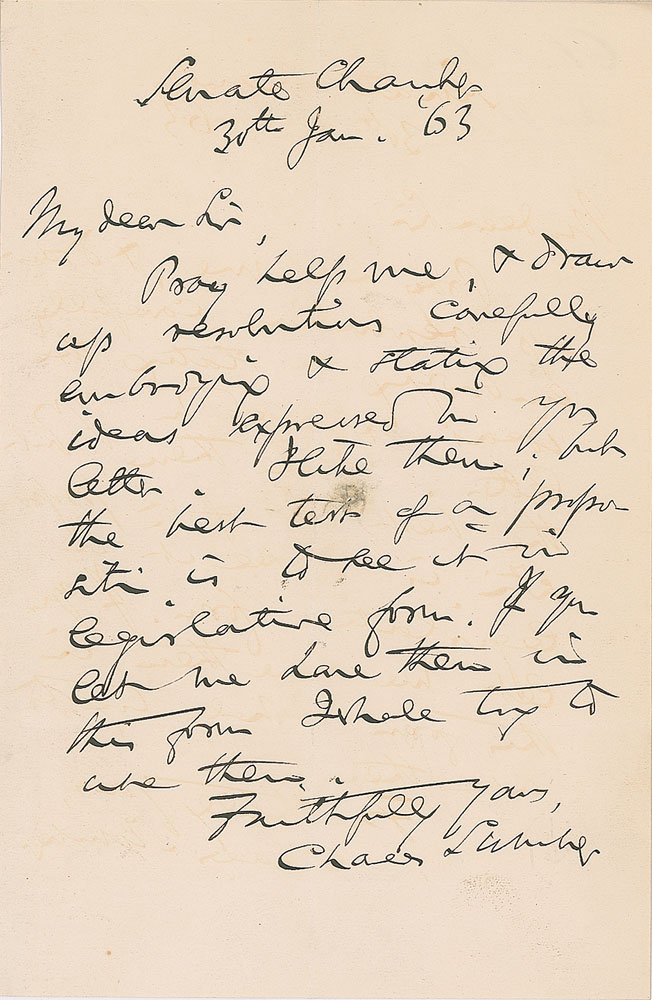 Civil War-dated ALS, one page, 4.75 x 7.25, January 30, 1863. Letter written from the Senate Chamber, in part: "Pray help me & draw up resolutions carefully embodying & stating the ideas expressed in your letter. I like them; but the best test?is to see it in legislative form. If you let me have them in this form I shall try to use them." In fine condition, with a small stain at the center.