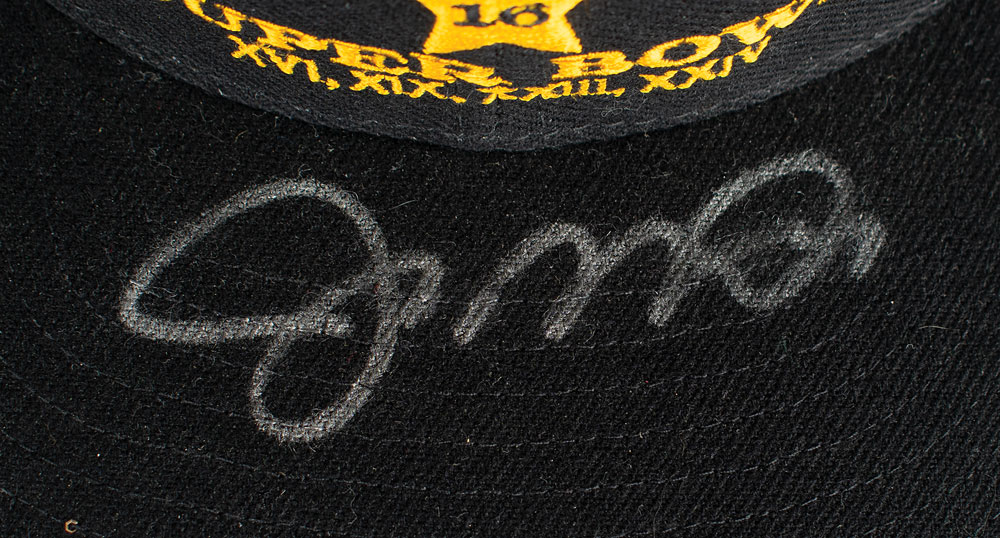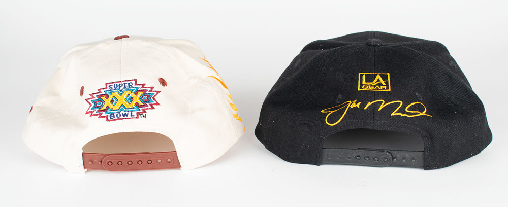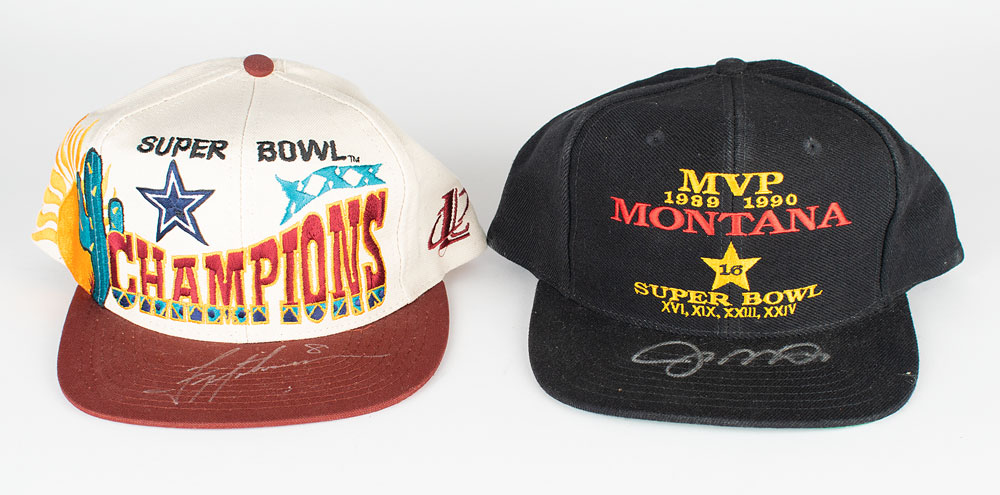 Two snapback caps signed by a Super Bowl MVP quarterback: a black 'Joe Montana' cap by LA Gear, with yellow and red stitching to crown honoring his Hall of Fame career, signed on the brim in silver ink by Joe Montana; and an official Super Bowl XXX cap by Loco Athletic, with embroidered designs to crown and back honoring the champion Dallas Cowboys, signed on the brim in silver ink by Troy Aikman, who adds his number, "8." In overall fine condition.