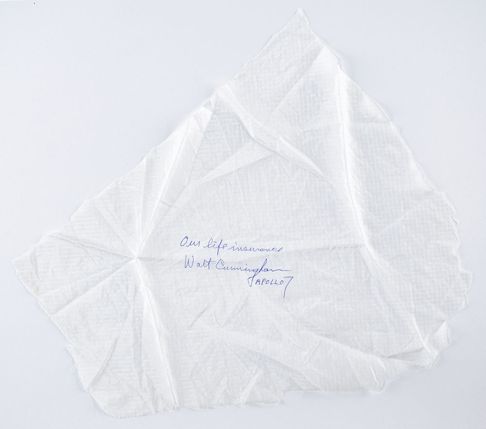 Large swatch of white parachute fabric, approximately 16 x 14, signed in blue ballpoint, "Our life insurance, Walt Cunningham, Apollo 7." In fine condition. with irregularly cut edges.