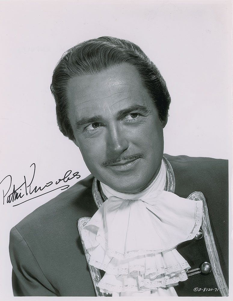 Glossy 7.5 x 9.75 bust-length photo of Patric Knowles in a period costume, signed in black felt tip. Reverse bears a Columbia Pictures credit stamp from 1952. In fine condition.