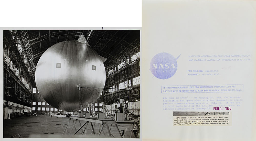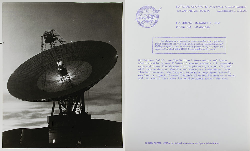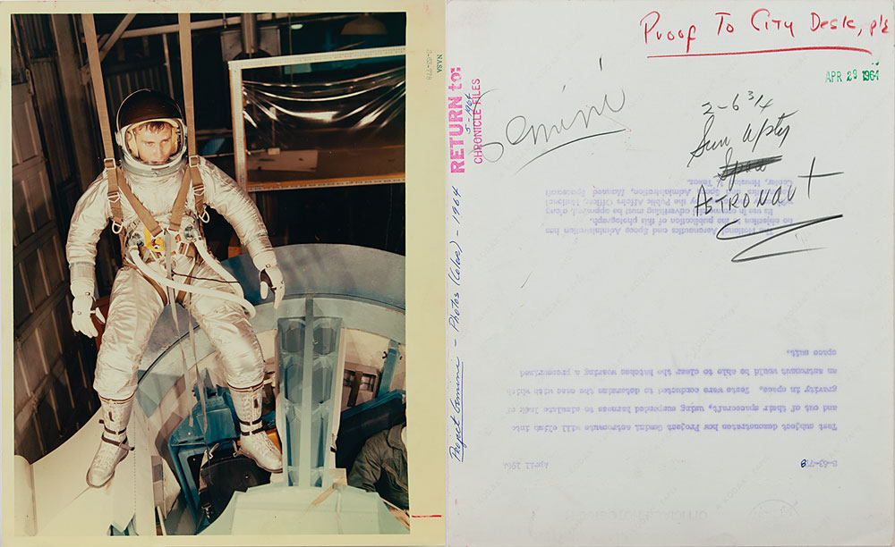 The highlight of the collection is a group of 16 official glossy NASA photos documenting the early designs and innovations of the Apollo Program, dated between 1962 and 1968, with all featuring NASA caption text on the reverse, and some bearing notations and affixed clippings. Includes three color black-numbered NASA examples, each bearing “A Kodak Paper” watermarks, notations, and a “Return to: Chronicle Files” stamp on reverse, with one photo, depicting a Gemini test astronaut being lowered into a mock spacecraft, bearing NASA caption text. Photo subjects include: a model prototype of the lunar lander (November 1963); the Echo II satellite (February 1965); a 16-foot wind tunnel at the Langley Research Center (February 1965); a 210-foot diameter tracking antenna for the Pioneer C interplanetary spacecraft (December 1967), and the airborne Lunar Landing Research Vehicle (November 1964).