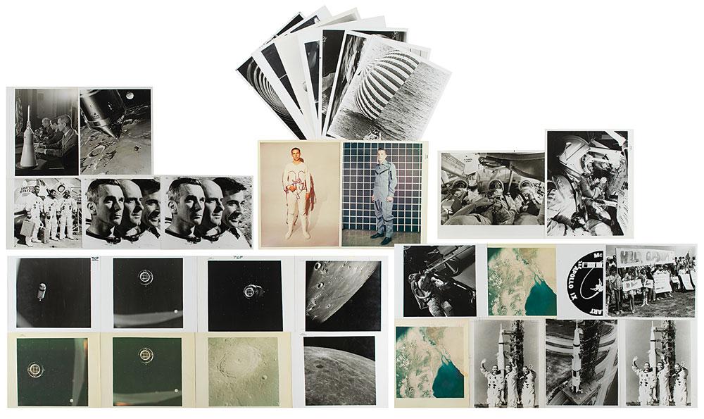 Apollo 10 (5)—various photos from the ‘dress rehearsal’ for the first moon landing, which includes the following images: two identical close-up portraits of the prime crew, a full-length portrait of the crew standing in their white space suits, the crew at a preflight press briefing at the Kennedy Space Center, and an artistic rendering of the CSM Charlie Brown and the LM Snoopy. Reverse of each photo bears NASA caption text, affixed clippings, and/or annotations. In overall very good to fine condition, with chips and wear to edges, and some scattered creasing, and some editorial notations to image sides.