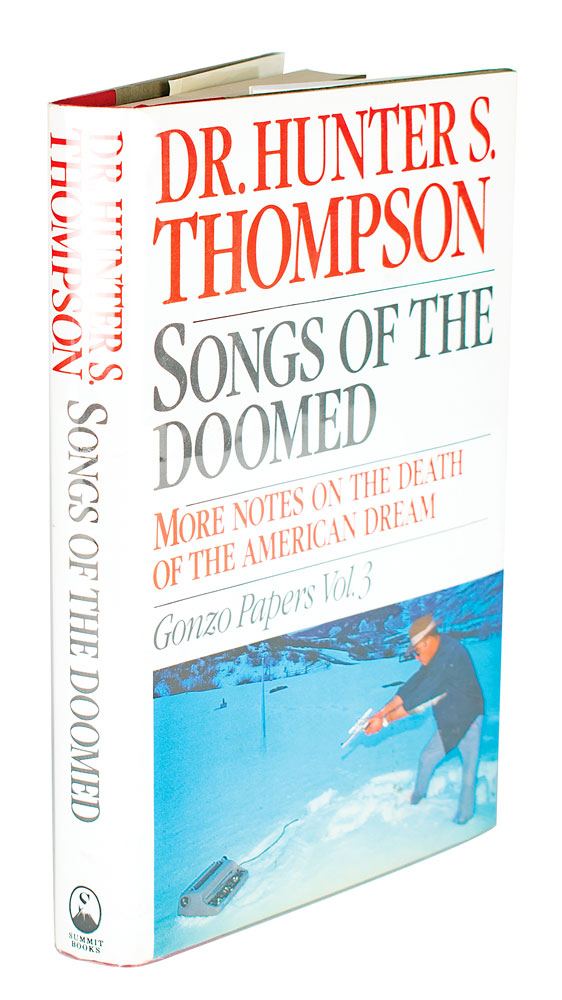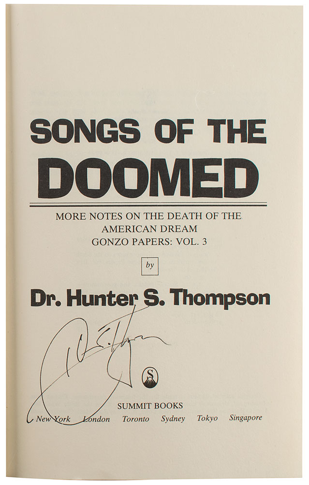 Signed book: Songs of the Doomed: More Notes on the Death of the American Dream: Gonzo Papers Vol. 3. First edition. NY: Summit Books, 1990. Hardcover with dust jacket, 6.5 x 9.5, 315 pages. Signed on the title page in black ink by Hunter S. Thompson. In fine condition.