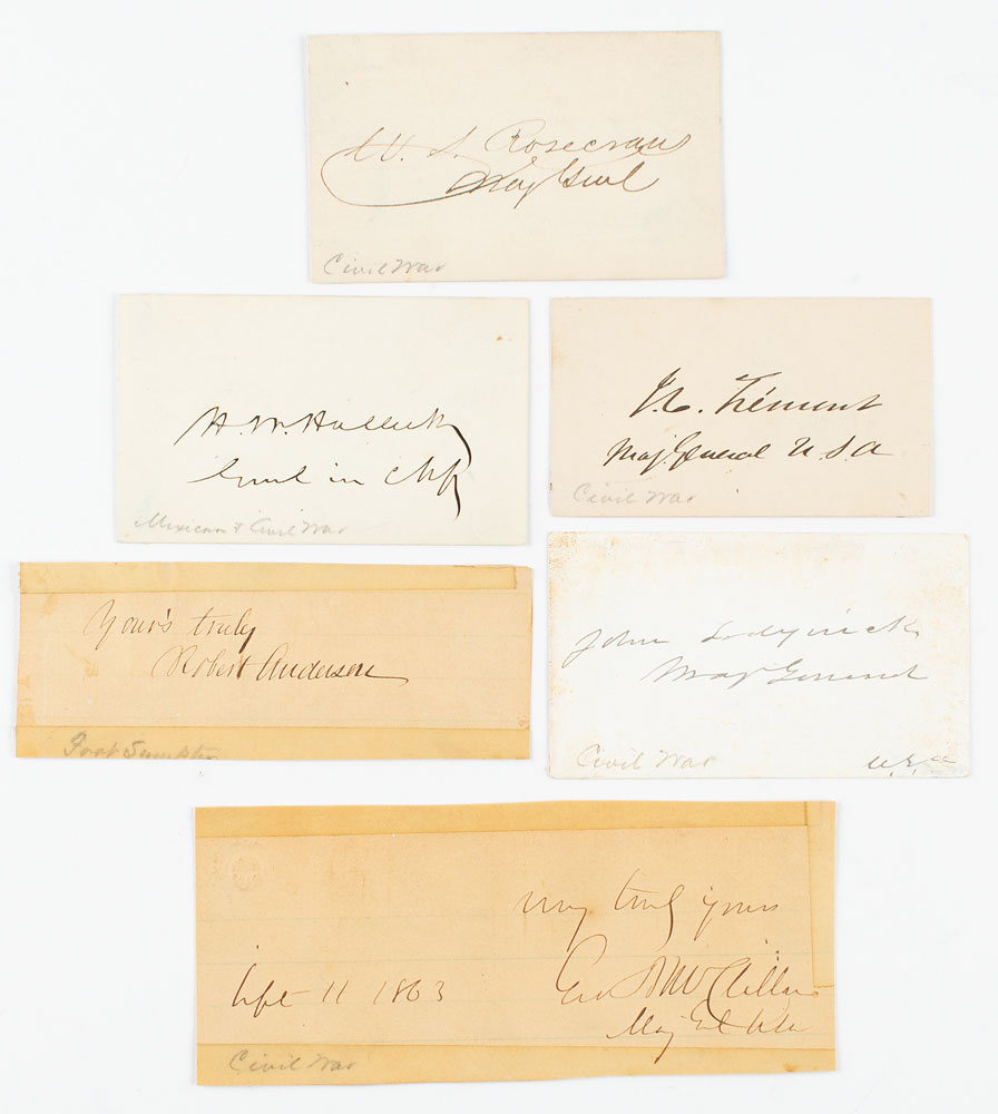 Desirable collection of six ink signatures of Union Generals on individual off-white sheets or cards ranging in size from 3 x 1.75 to 5 x 2, including: Robert Anderson, "Yours truly, Robert Anderson"; John C. Frémont, "J. C. Frémont, Maj. General, U.S.A."; Henry Halleck, "H. W. Halleck, General in Chief"; George B. McClellan, "Very truly yours, Geo. B. McClellan, Maj. Genl. USA, Sept. 11, 1863"; William Rosecrans, "W. S. Rosecrans, Maj. Genl."; and John Sedgwick, "John Sedgwick, Maj. General." In overall very good to fine condition, with some light staining to Sedgwick, and toning to McClellan and Anderson.
