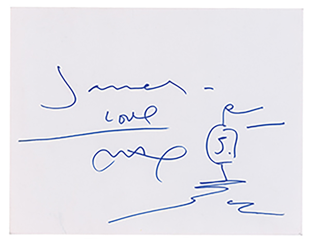 Original sketch by Peter Max of what appears to be a sailboat drifting away, accomplished in blue felt tip on a white 8.5 x 11 sheet, signed and inscribed, "James, love, Max." In fine condition.