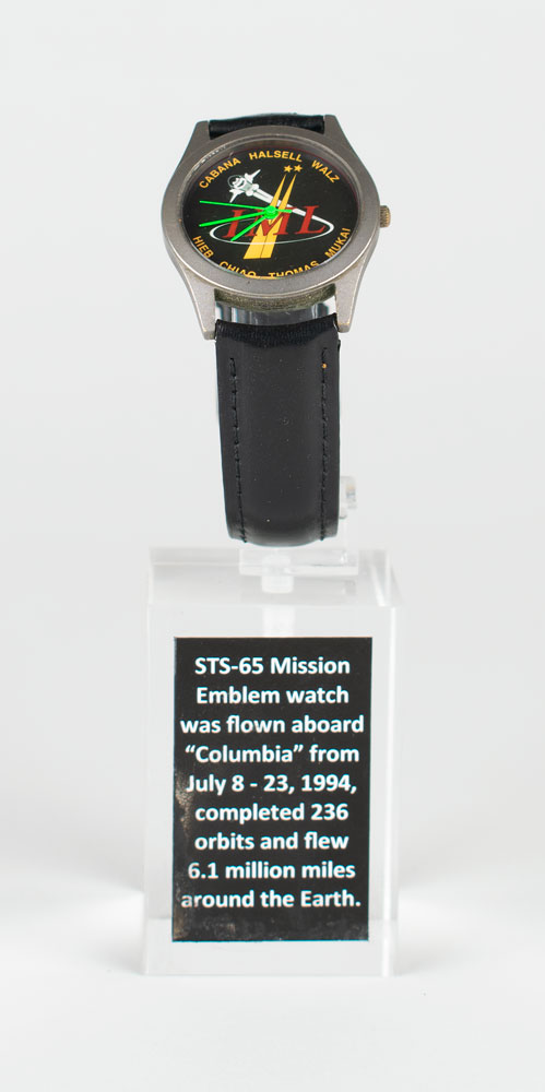 Custom-made watch carried into space on the STS-65 mission, featuring the mission insignia on the face, green hands, and a black leather bracelet. Includes a display stand with engraved plaque: "STS-65 Mission Emblem watch was flown aboard 'Columbia' from July 8-23, 1994, completed 236 orbits and flew 6.1 million miles around the Earth." The watch has no serial number or maker indicated. In fine condition, with expected wear to the watchband from use. Accompanied by a letter of provenance fully signed by the STS-65 crew—Robert Cabana, James Halsell, Rick Hieb, Carl Walz, Leroy Chiao, Donald Thomas, and Chiaki Mukai—in part: "This STS-65 watch was flown aboard the United States Space Shuttle Columbia July 8, 1994, through July 23, 1994. Launching from the Kennedy Space Center, Florida, Columbia and its crew of seven astronauts completed 236 orbits of the Earth, traveling 6.1 million miles before landing back on Runway 33 at the Kennedy Space Center, Florida." Also includes an official color NASA lithograph depicting the STS-65 crew and an informational brochure about the International Microgravity Laboratory (IML-2), which hosted experiments in life sciences and microgravity on STS-65.