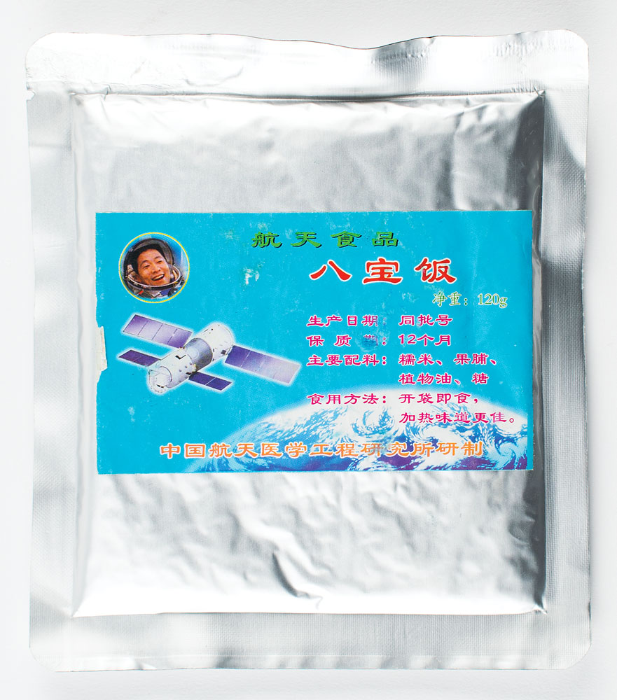 Souvenir package of freeze-dried Chinese space food, 5″ x 5.75″ x .25″, with a colorful label affixed on the front. In fine condition.
