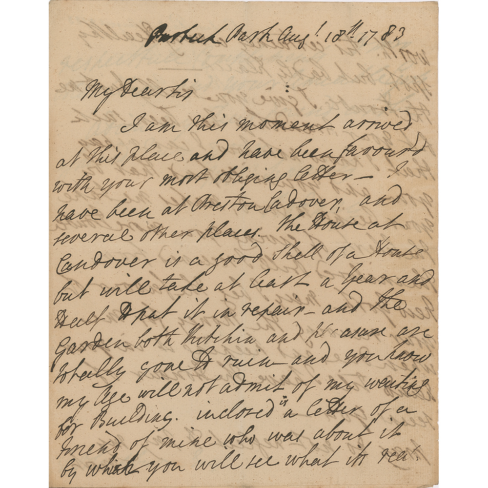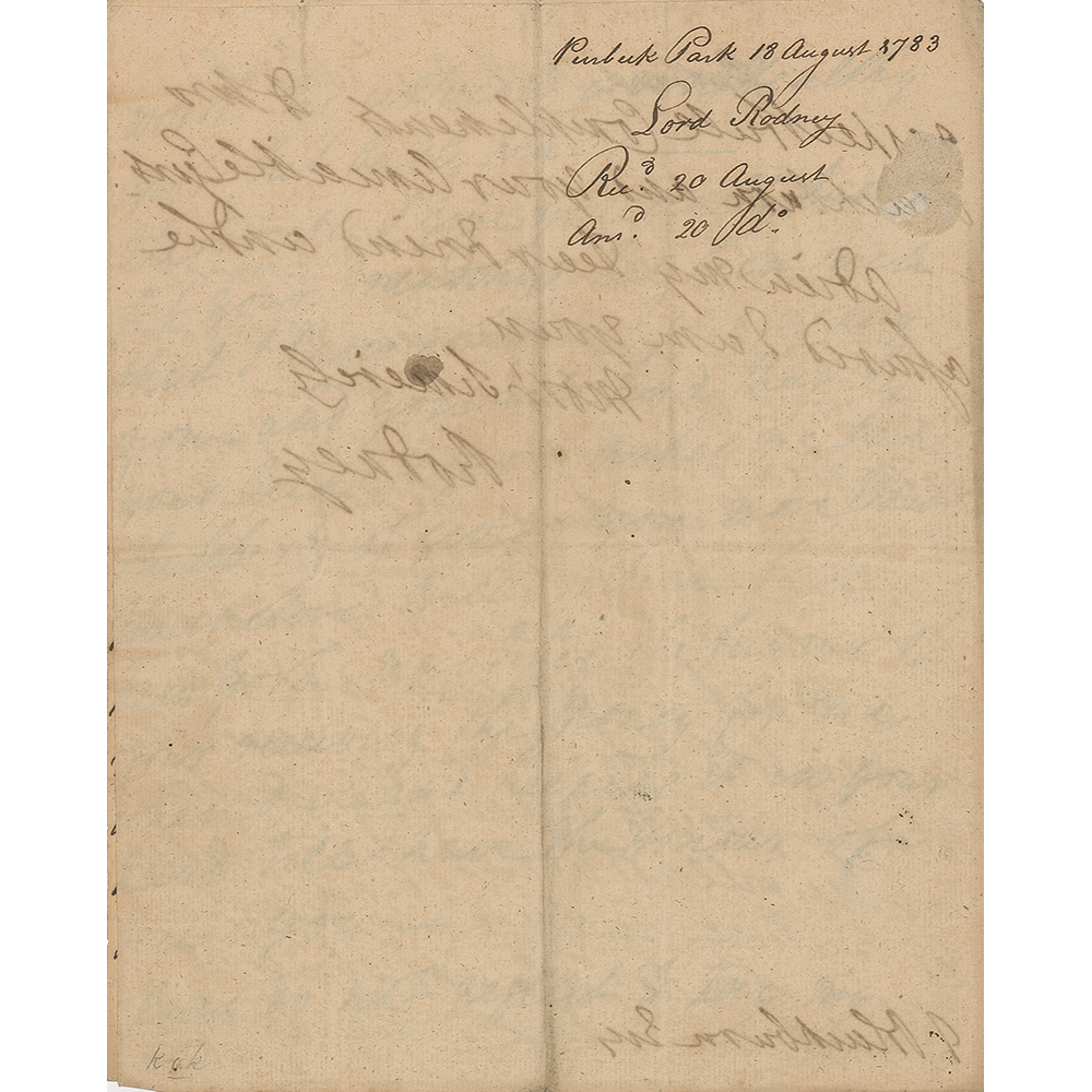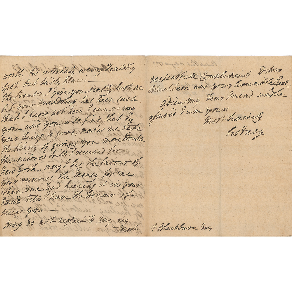 British naval officer (1718-1792) who is best known for his commands in the American War of Independence, particularly his victory over the French at the Battle of the Saintes in 1782. It is often claimed that he was the commander to have pioneered the tactic of 'breaking the line.' Scarce ALS signed “Rodney,” three pages on two adjoining sheets, 7.5 x 9.5, August 18, 1783. Written from Purbeck Park in Portsmouth, England, a letter to J. Blackburn, concerning his efforts to find a suitable home in retirement, in part: “I am at this moment arrived at this place?The house at Candover is a good shell of a House but will take at least a year and half to put it in repair?and you know my age will not admit of my waiting for building. Enclosed is a letter of a friend of mine who was about it by which you will see what its real worth. Tis certainly a very healthy spot, but badly placed. The trouble I give you really hurts me but your friendship has been such that I know not how I can repay you and you will find that by your being so good, makes me take the liberty of giving you more trouble. The enclose bill I received from New York. May I beg the favor or your receiving the money for me when due and keeping it in your hand till I have the honor of seeing you. Pray do not neglect to pay my respectable compliments to Mrs. Blackburn and your amiable gents. Adieu my dear friend." In fine condition, with writing showing through from opposing sides. Accompanied by an 1811 engraving of the Admiral by Joyce Gold of London.
