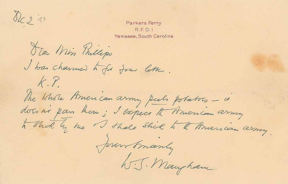 ALS signed “W. S. Maugham,” one page, 8.5 x 5.5, Parkers Ferry letterhead, December 2, 1943. Letter to Alice B. Phillips, in full: "I was charmed to see your letter. K. P. The whole American army peels potatoes—it doesn't pare them; I expect the American Army to stick by me & I shall stick to the American Army." In very good to fine condition, with a few stains. Accompanied by the original hand-addressed mailing envelope and a letter of provenance from the recipient, who explains that she initially wrote Maugham to complain of his usage of 'peel' and 'pare' in a story he wrote for Collier's.