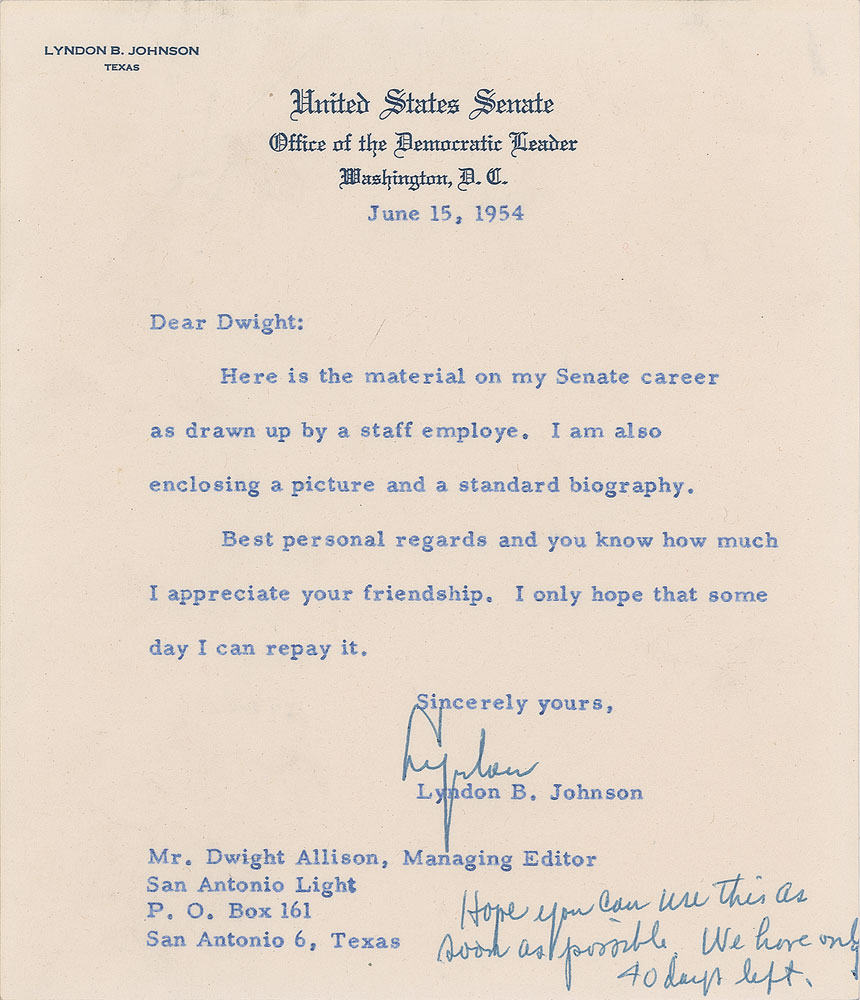 TLS signed “Lyndon,” one page, 6 x 7, United States Senate letterhead, June 15, 1954. Letter to Dwight Allison, managing editor of the San Antonio Light newspaper, in full: "Here is the material on my Senate career as drawn up by a staff employe[e]. I am also enclosing a picture and a standard biography. Best personal regards and you know how much I appreciate your friendship. I only hope that some day I can repay it." Johnson adds a handwritten postscript: "Hope you can use this as soon as possible. We have only 40 days left." In very good to fine condition, with trimmed edges and some creasing.