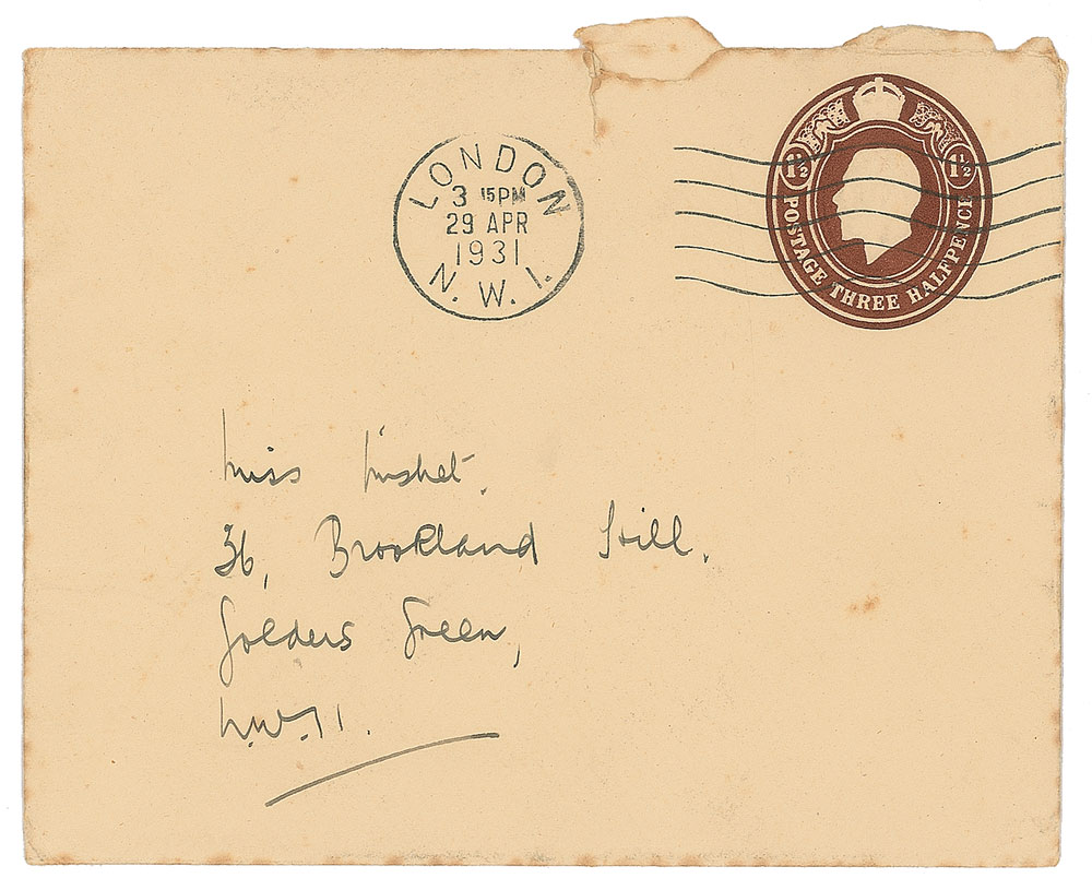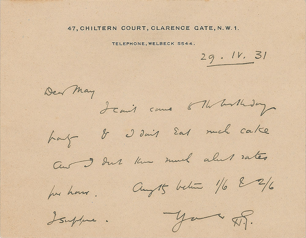 ALS signed “H. G.,” one page, 4.5 x 3.5, 47 Chiltern Court stationery card, April 29, 1931. Letter to May Mishet, in part: "I can't come to the birthday party & I don't eat much cake and I don't know much about rates per hour." In fine condition. Accompanied by the original hand-addressed mailing envelope.