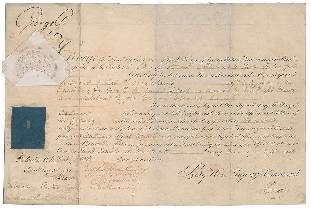 Partly-printed vellum DS, signed “George R.,” one page, 13.75 x 9.25, January 13, 1795. King George appoints "Our Trusty and Welbeloved William Porter?to be Lieutenant?in our Hundred & Fourteenth Regiment of Foot." Signed in the upper left corner by King George III, and countersigned by William Cavendish-Bentinck, 3rd Duke of Portland, who would later serve as the Prime Minister of the United Kingdom. Left side retains the original white and blue paper seals. In fine condition, with light overall soiling.