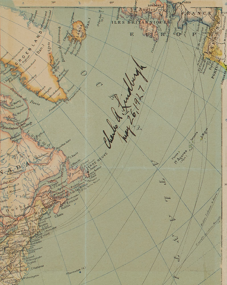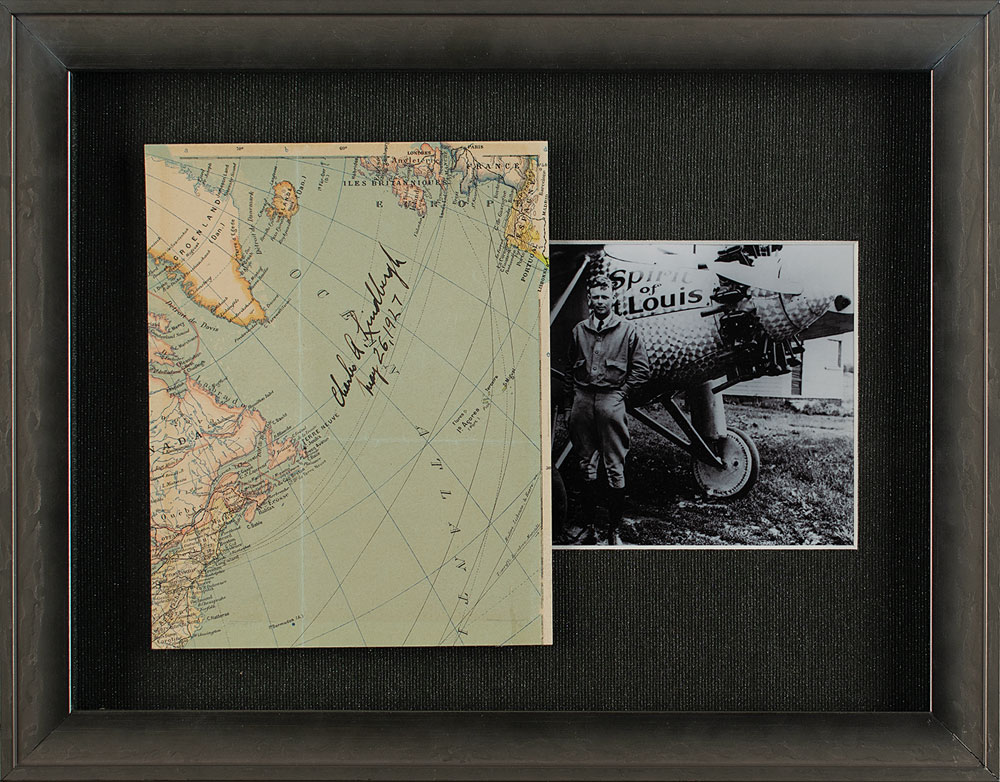 Interesting map segment of the North Atlantic Ocean showing the area that Lindbergh famously crossed in May 1927, 6.25 x 7.75, boldly signed in fountain pen, "Charles A. Lindbergh, May 26, 1927." Affixed to a same-size piece of cardstock mount and attractively framed with a photo to an overall size of 15.5 x 12.25. In fine condition, with intersecting folds. Lindbergh became an international hero when he made the first non-stop flight across the Atlantic from May 20-21, 1927, flying from New York to Paris in the Spirit of St. Louis, a single-engine monoplane. He signed this map just five days after landing, while still being feted in France. A unique, historic piece from a momentous occasion.