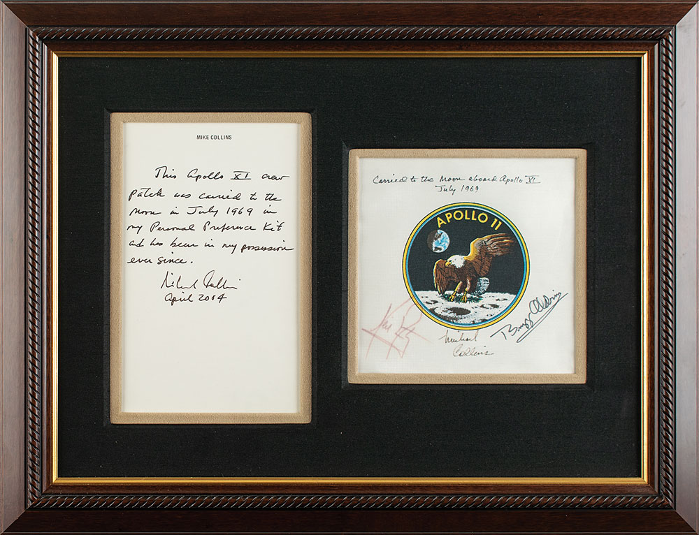 Michael Collins's exceptional flown 5.5 x 5.5 swatch of Beta cloth featuring the Apollo 11 insignia carried to the moon during the first lunar-landing mission, signed and flight-certified in black felt tip, "Carried to the Moon aboard Apollo XI, July 1969, Michael Collins," and also signed by his crewmates, "Neil Armstrong" and "Buzz Aldrin." Handsomely double-matted and framed beside a handwritten letter of provenance signed by Collins, dated April 2004, in full: "This Apollo XI crew patch was carried to the moon in July 1969 in my personal preference kit and has been in my possession ever since." In fine condition. A superb flown format fully signed by the first lunar landing crew, boasting excellent provenance from the collection of the CMP. An attractively displayed, spectacular piece of space history.