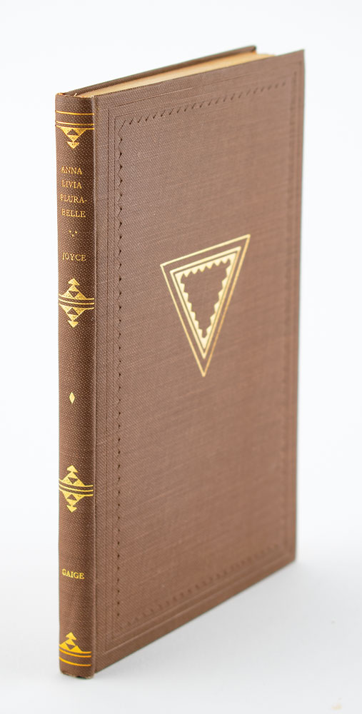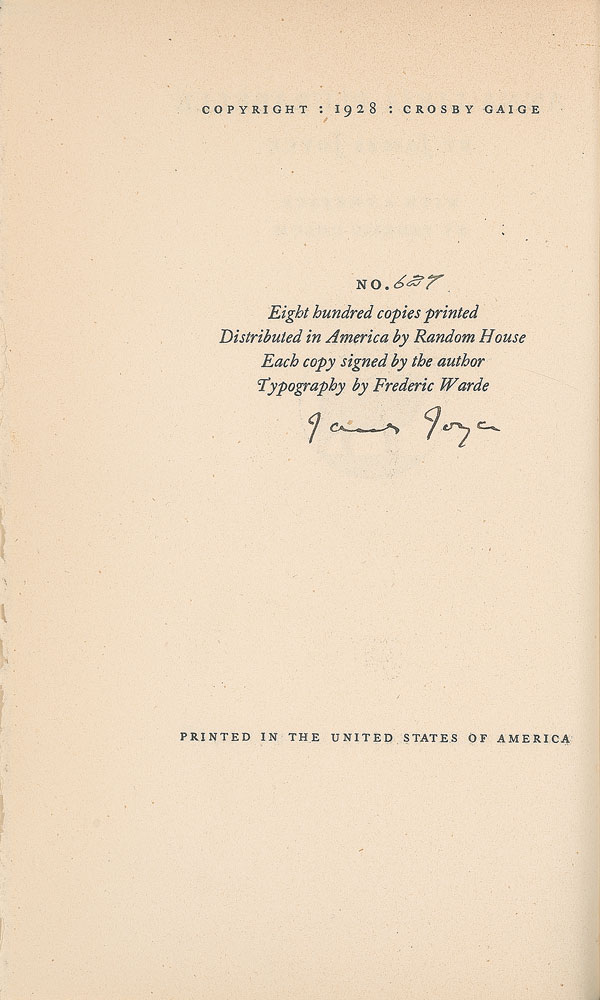 Signed book: Anna Livia Plurabelle. First edition, limited issue, numbered 627/800. NY: Crosby Gaige, 1928. Hardcover, 4.75 x 7, 61 pages. Boldly signed on the colophon in fountain pen, "James Joyce." Autographic condition: fine. Book condition: VG+/None, with an ink notation to title page.