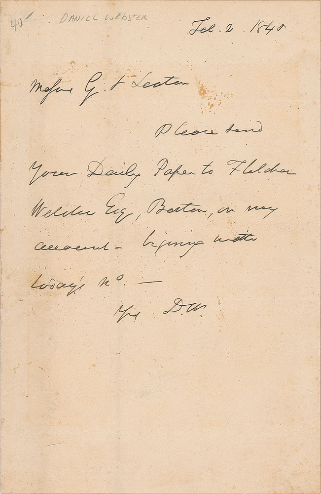 ALS signed “D. W.,” one page, 4.75 x 7.25, February 2, 1840. Letter to the publishers Gales and Seaton, in full: "Please send your Daily Paper to Fletcher Webster Esq., Boston, on my account—beginning with today's No." In very good to fine condition, with scattered light staining, and old adhesive residue along the edge of the integral address leaf. William Winston Seaton and Joseph Gales were the publishers of the Daily National Intelligencer, which was the first newspaper published in Washington, D.C. and for many years the district's most dominant publication.