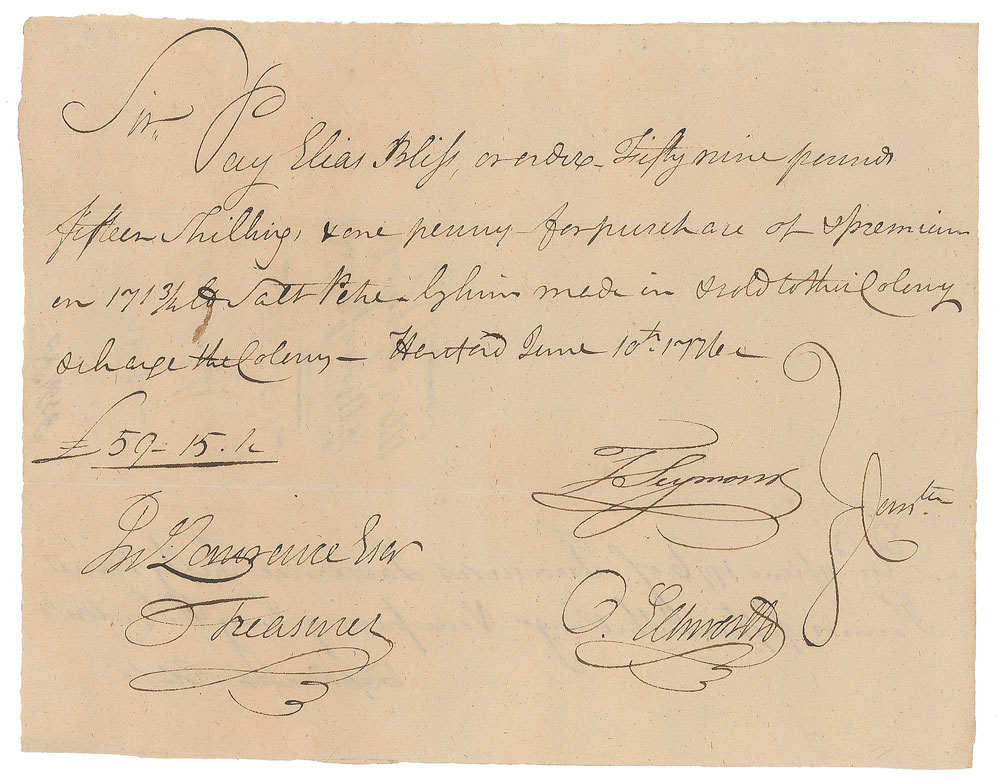 Revolutionary War-dated manuscript DS, signed “O. Ellsworth,” one page, 8.25 x 6.5, June 10, 1776. Pay order issued to Treasurer John Lawrence, in part: "Pay Elias Bliss, or order, Fifty nine pounds fifteen shillings, & one penny for purchase of premium on 171 3/4 lbs Salt Petre?made in & sold to this Colony & charge the Colony." Signed at the conclusion by Oliver Ellsworth. In fine condition. Accompanied by a color engraving bearing a preprinted signature.