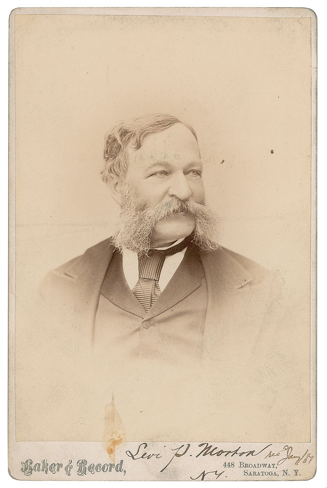 Uncommon 4.25 x 6.5 cabinet portrait of Levi P. Morton in a bust-length pose, signed in the lower border in ink. Notation to lower right dates the signature to January 1887. Published by the Baker and Record Studio of Saratoga Springs, New York. In very good to fine condition, with light scuffing, and a stain at the bottom.