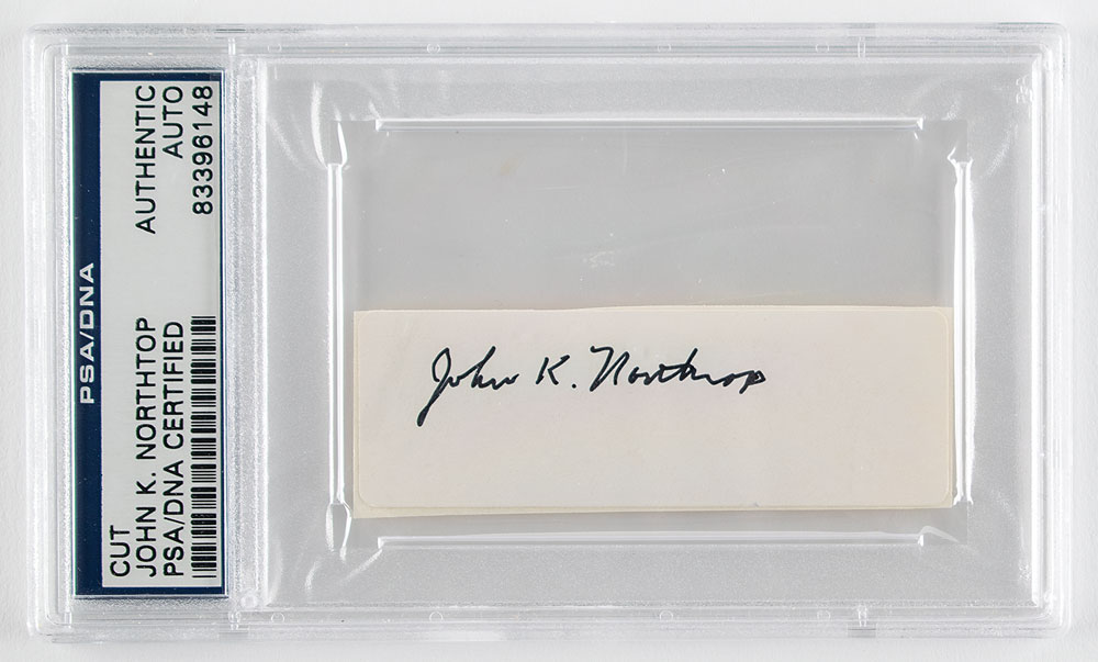 American aeronautics engineer and industrial designer (1895-1981). Felt tip signature, "John K. Northrop,” on an off-white 3 x 1 slip. In fine condition. Encapsulated in a PSA/DNA authentication holder.