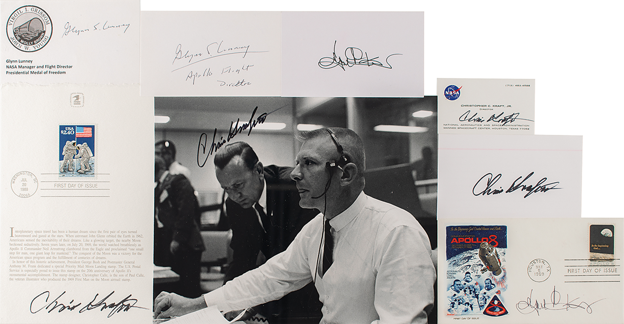 Group of eight items signed by NASA flight directors, including Gene Kranz (FDC and signature), Glynn Lunney (two signatures), and Chris Kraft (signed photo, business card, signature, and stamp souvenir). In overall fine condition.