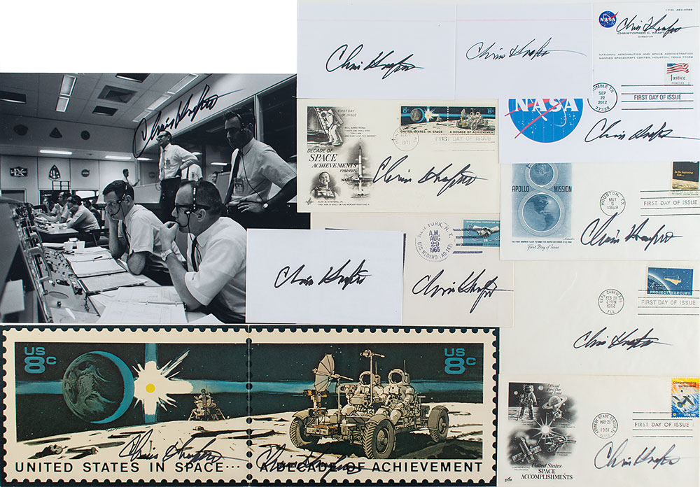 Group of 12 items signed by Chris Kraft, including: a stamp souvenir (signed twice), signed photo, business card, five FDCs, a Gemini 5 recovery cover, and three signatures. In overall fine condition.