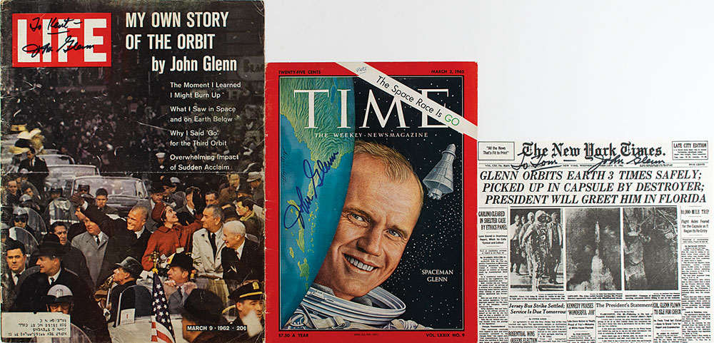 Three items: an original magazine cover from the March 2, 1962 issue of Time, signed in blue felt tip, "John Glenn"; an original magazine cover from the March 9, 1962 issue of Life, signed and inscribed in black felt tip, "To Kent—John Glenn"; and a souvenir photocopy of the February 21, 1962 front page of the New York Times, signed and inscribed in black felt tip, "To Tom—John Glenn." In overall very good to fine condition, with some creasing to the magazine covers.