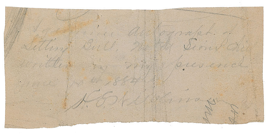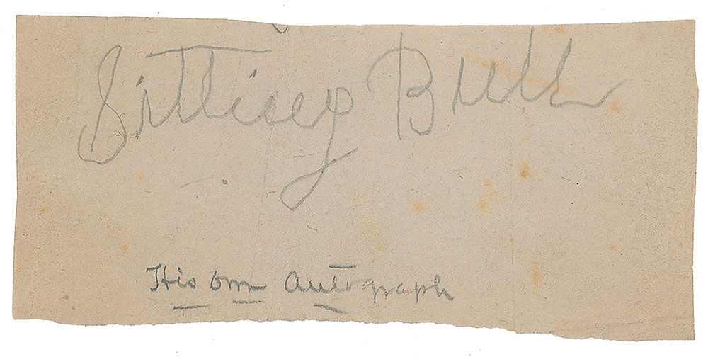 Hunkpapa Lakota Sioux holy man (circa 1831-1890) known for his steadfast opposition to the intrusion of the US government into Sioux lands. Fleeing to Canada following the Battle of Little Big Horn, he later returned to the US and toured with Buffalo Bill's Wild West Show. Fearing his growing influence, government agents fatally shot him during an arrest attempt at Standing Rock Agency on December 15, 1890. Very rare and highly sought-after pencil signature, "Sitting Bull,” on an off-white 5.75 x 2.75 slip, with a contemporary collector's notation below, "His own autograph." The reverse bears a handwritten witness statement: "A genuine autograph of Sitting Bull, noted Sioux chief, written in my presence, June 10th 1884, H. G. Williams." In very good to fine condition, with light overall creasing. Accompanied by a full letter of authenticity from PSA/DNA.