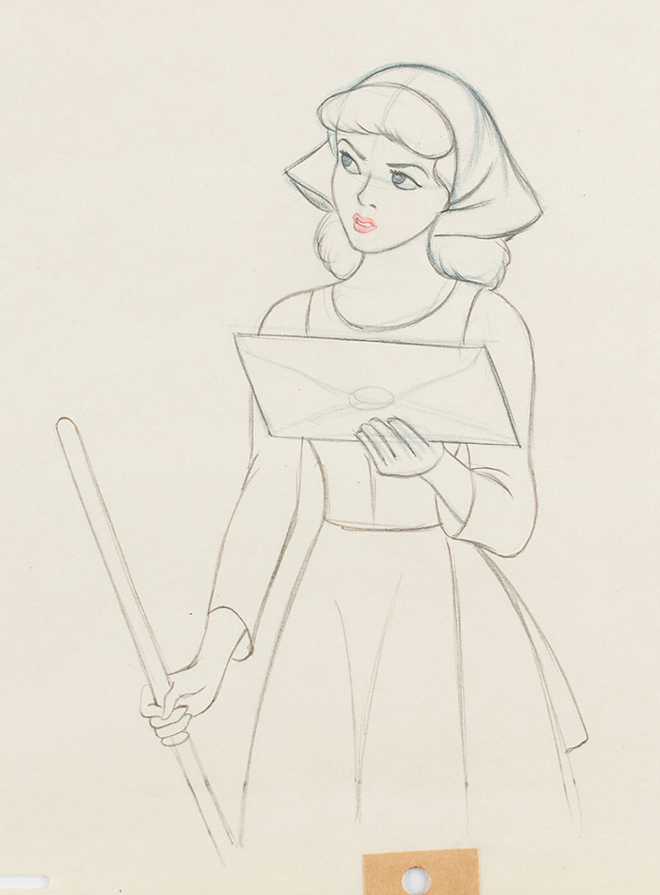(Walt Disney Studios, 1950) Classic original production drawing featuring Cinderella from Cinderella, showing her as a scullery maid early in the film. Accomplished in graphite and colored pencil on untrimmed 12 x 10 animation paper, marked "37" in the lower right corner. Image measures 4.5 x 7. In fine condition. A large and appealing production drawing of Disney's popular princess.